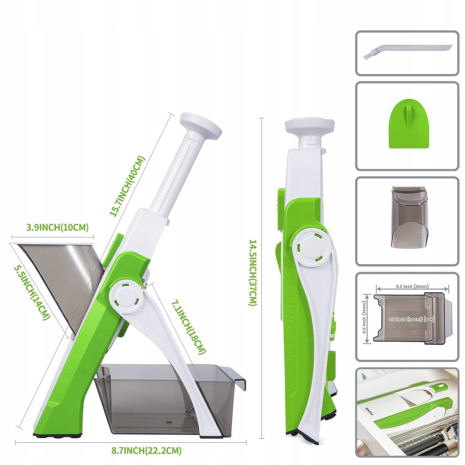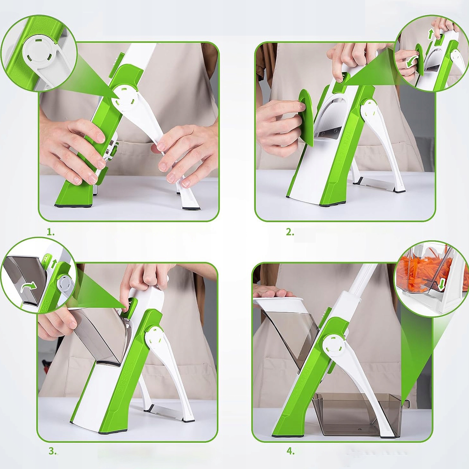 Збережіть свій час! - Простий у використанні - відрегулюйте товщину та відстань лопатей ручкою та кнопками на задній частині ріжучої машини та підтримуйте ручку невеликими зусиллями. Ви також можете легко обробити попередньо оброблені овочі, такі як Julienne, виготовлена з моркви, шматочки огірків, фрі, кубиків томатів тощо, понад 30 різних шматочків. Перед використанням прочитайте додані інструкції.