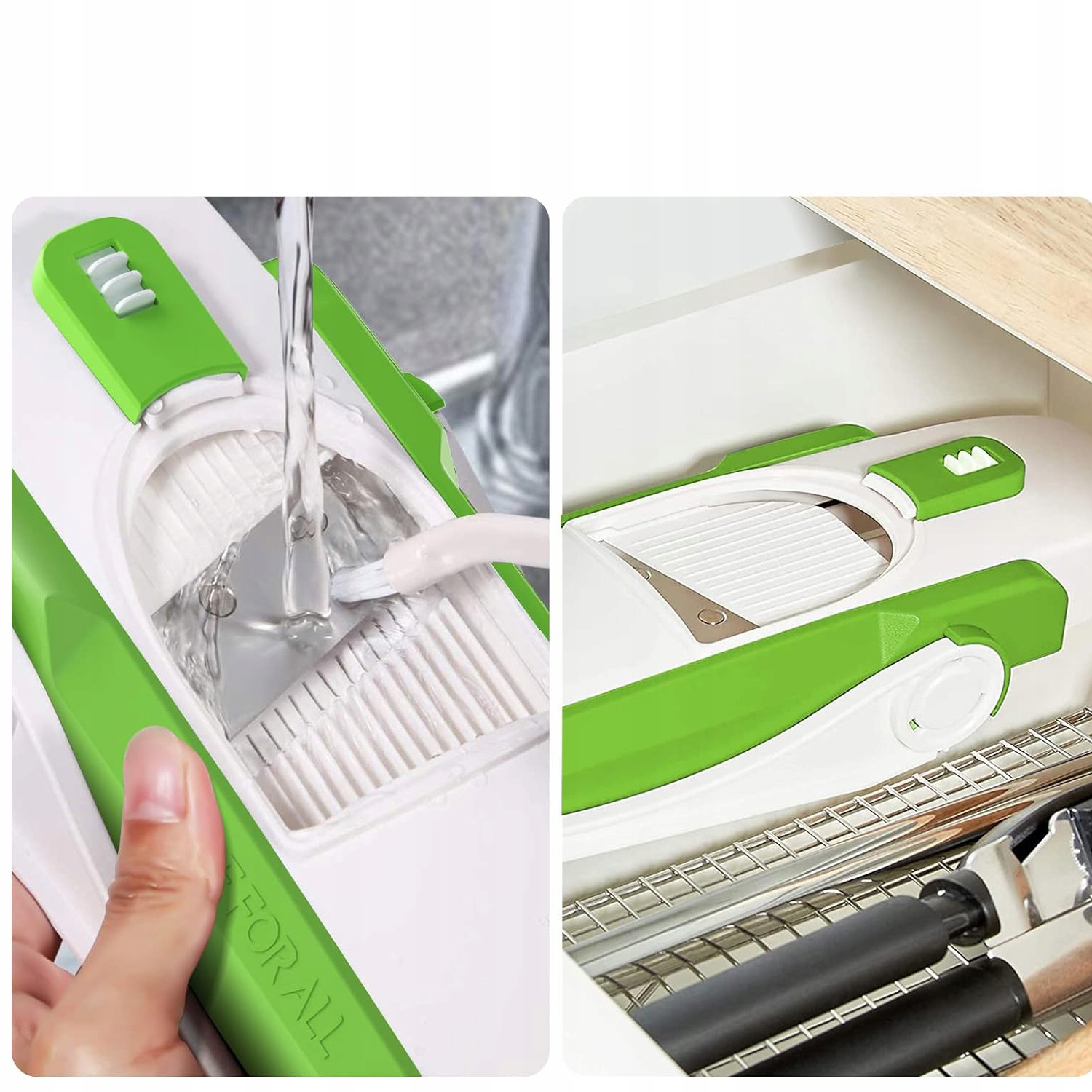 зручно: легко очистити та зберігати - після різання просто промийте нарізку мандоліну до кухні під краном, а потім використовуйте кріплену щітку, щоб краще очистити тріщини на ножі. Ви також можете використовувати посудомийну машину, це безпечно. Цей харчовий ніж може бути складений до невеликого розміру, легко зберігати і займає дуже мало місця.
