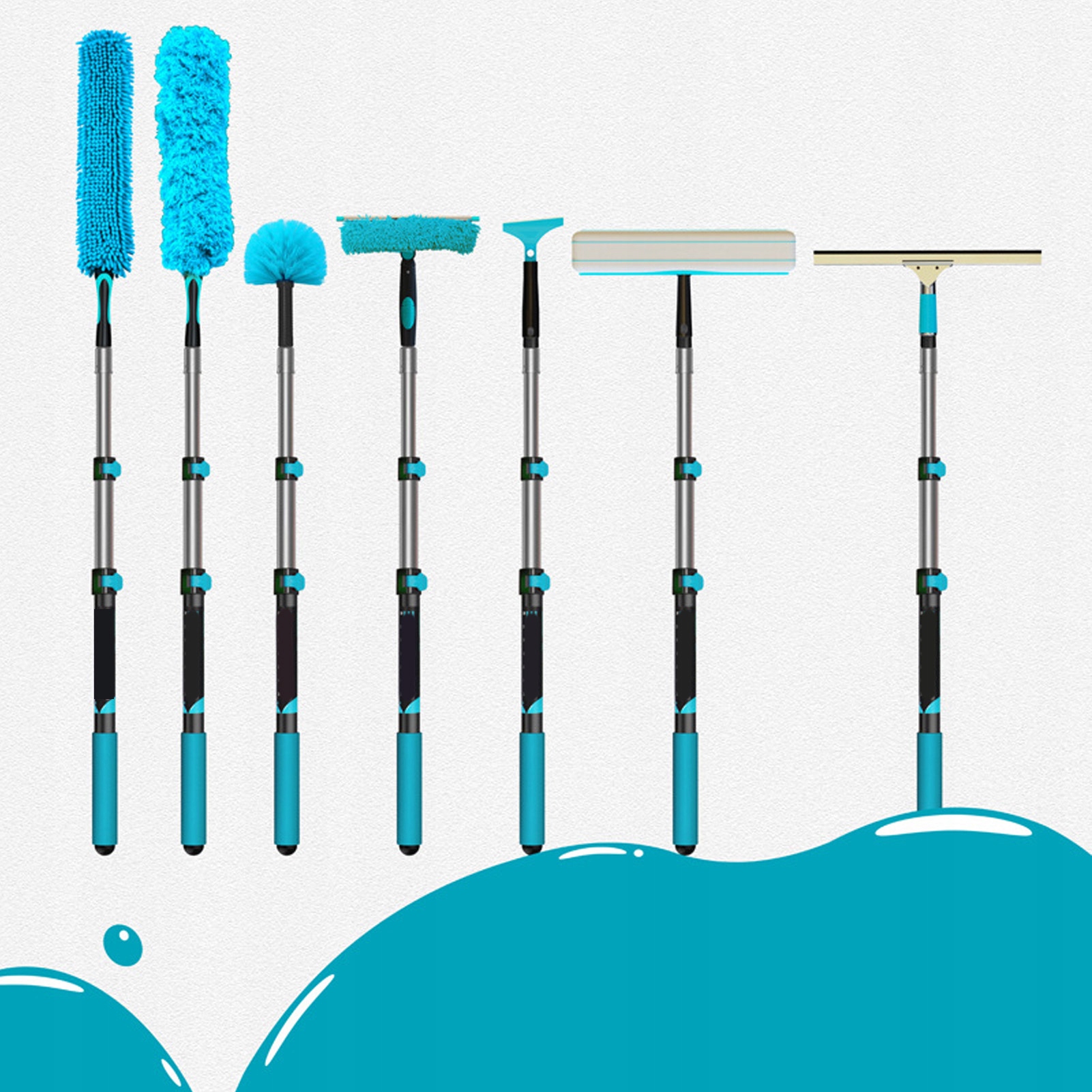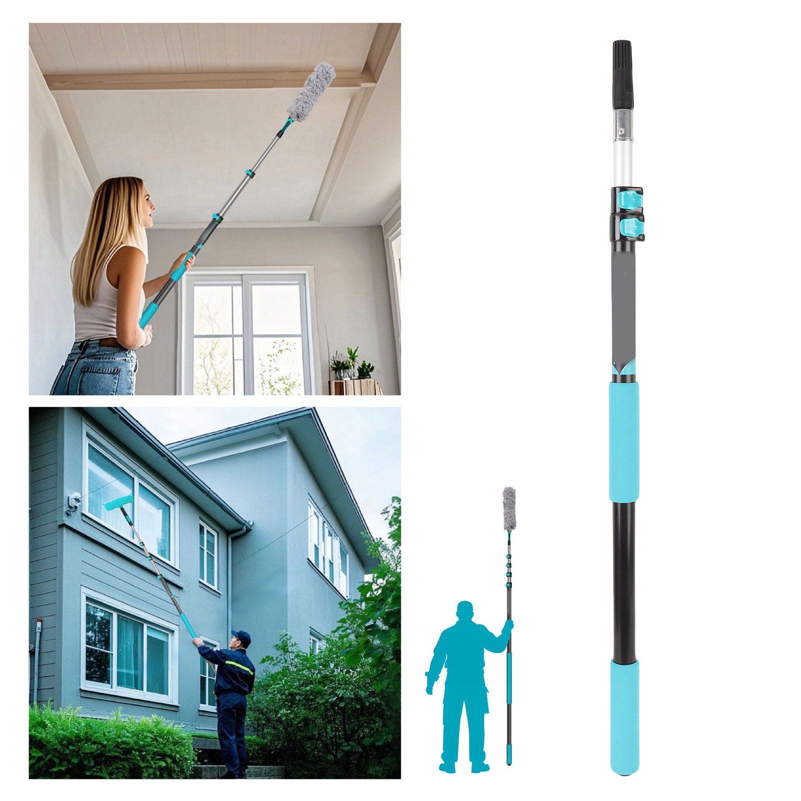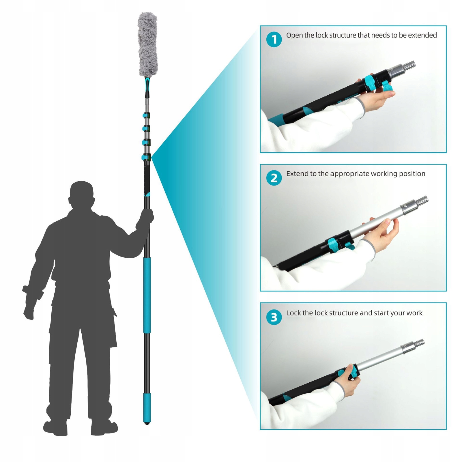Функція:1. Регульована довжина з надійною системою фіксації: подовжена палиця має чотири зворотні замки, що дозволяє плавно регулювати довжину від 2,76 футів (компактний) до 6,56 футів (повністю висунутий). Це усуває потребу в драбинах під час прибирання високих стель, заміни лампочок або доступу до горищних приміщень, забезпечуючи безпечний рівень землі для завдань із важким доступом.