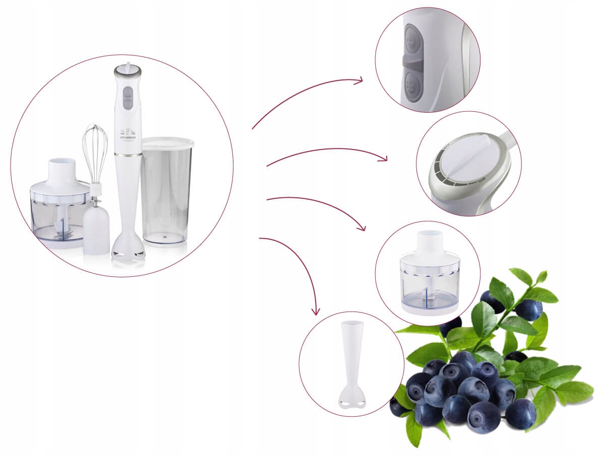 Ручний блендер Hyundai HB 983 – це практичний пристрій 3-в-1, який пропонує широкий спектр застосування на кожній кухні. Завдяки зміннимнаконечникам він може працювати як блендер, віночок і подрібнювач. Дозволяє збивати піну, подрібнювати та пюрувати. Він точно буде незамінним при приготуванні будь-яких крем-супів або мусів. Завдяки йому ви також можете легко, швидко і зручно нарізати овочі. Крім того, в набір входить ємність, в якій можна приготувати смачний коктейль.