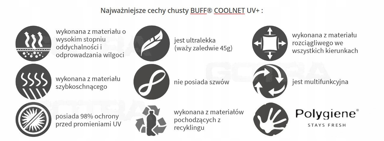 4 . Використовуваний матеріал UV+ Coolnet дає високий захист від сонячного випромінювання. 4 Залежно від потреб, він буде служити шапкою, балаклавою, маскою, пов'язкою на голову або шарфом, ідеально захищаючи голову, обличчя, шию. видалення вологи; Ефект охолодження та сухість під час тренувань у теплі та сонячні дні. Шкіра і обмежує потворний запах навіть під час тренувань. Окружність голови: 50 - 58 см Загальна довжина: 53 см Матеріал: 95% Поліестер Мікрофібра, 5% Еластан Вага: 45 г