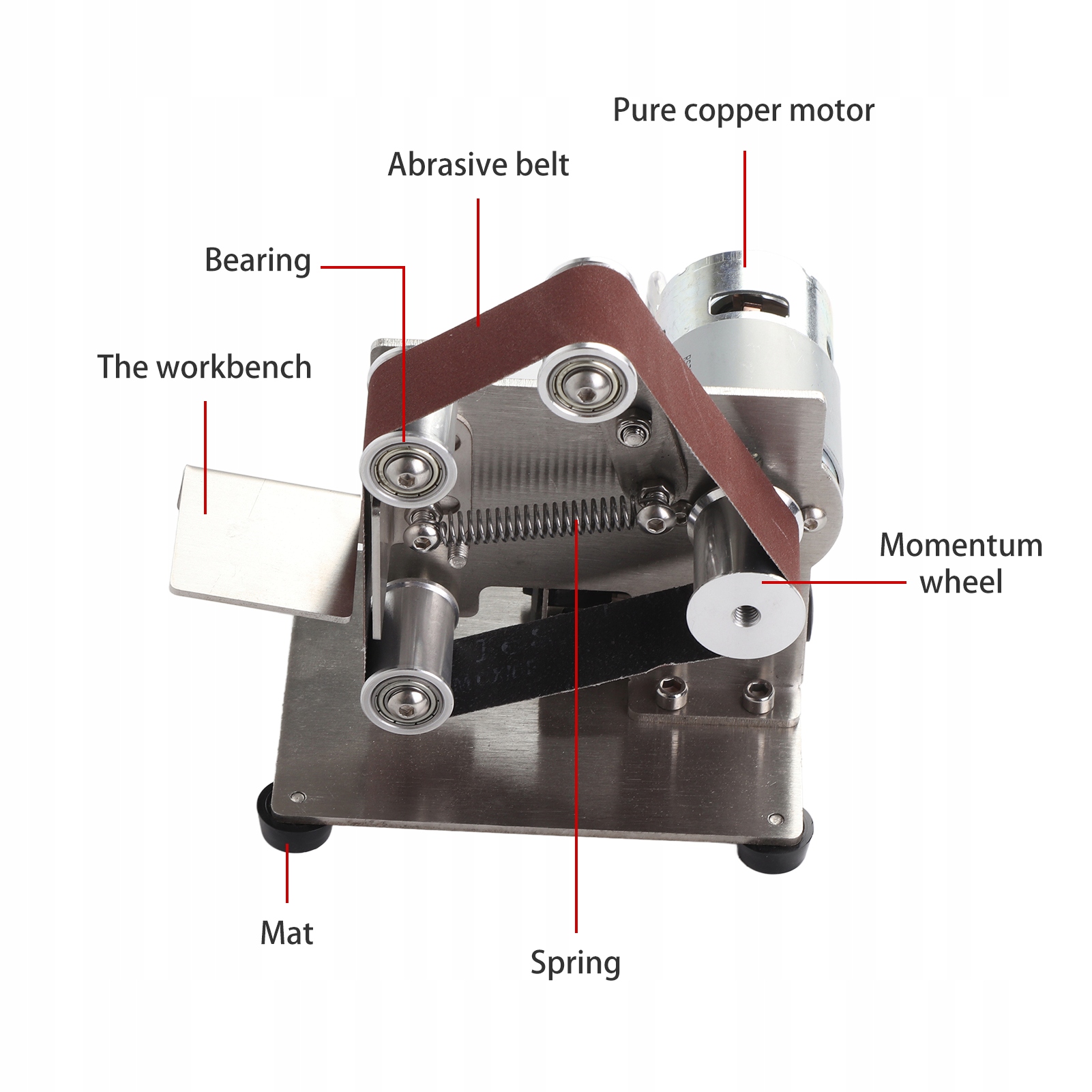- Це багатофункціональний стрічковий шліфувальний верстат, міні-портативний, має низький рівень шуму, простий у встановленні та експлуатації.