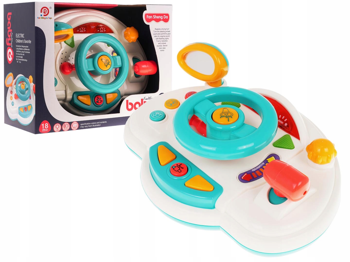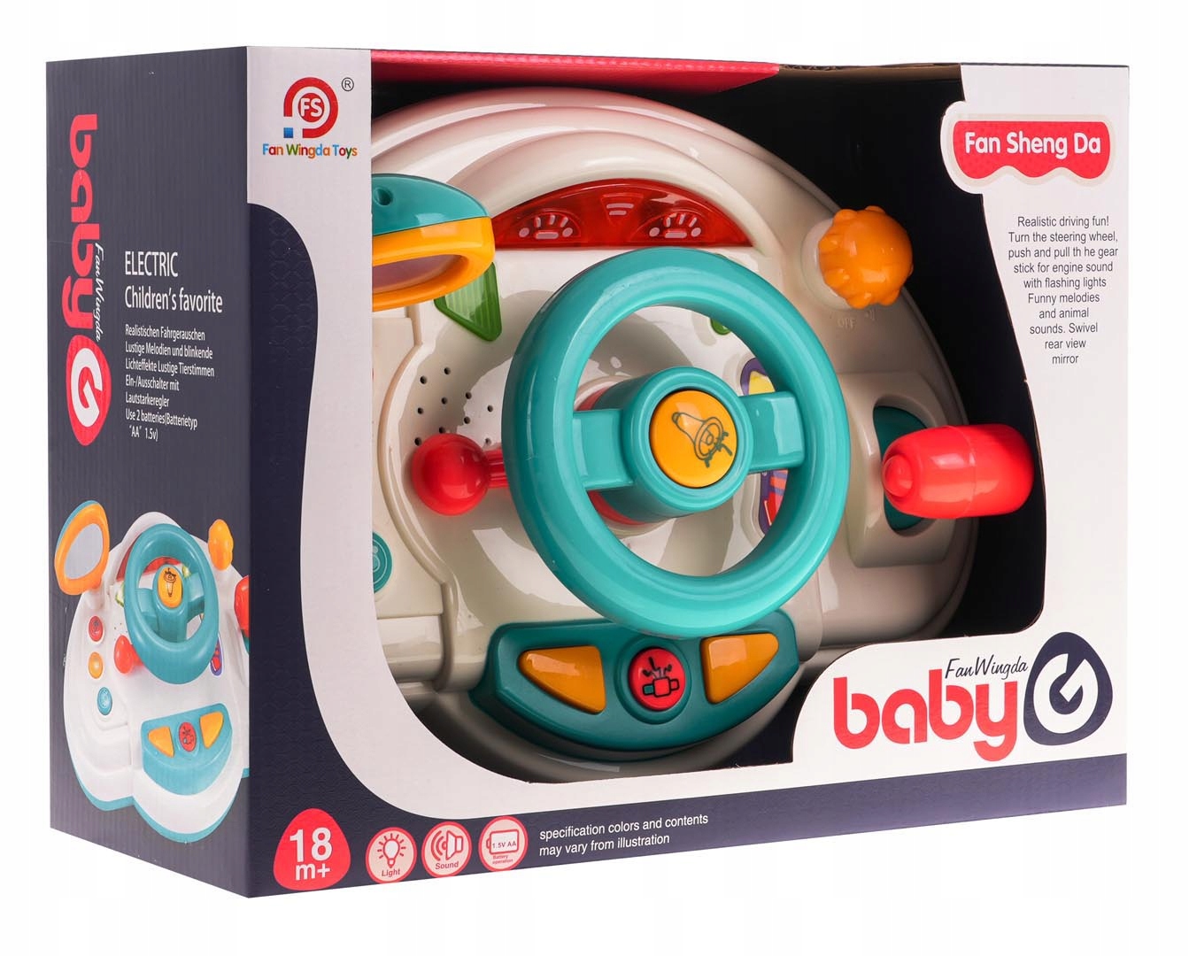 4 Іграшка виготовлена з найкращої якості пластику в яскравих кольорах, які приваблюють очі дитини. Після запуску іграшки ми почуємо характерні звуки запуску та керування транспортним засобом. Рульове колесо можна зняти, посередині керма є кнопка з рогом. У верхньому лівому куті є регульоване дзеркало, а під ним три кнопки, що запускають кумедні мелодії. Після натискання напрямку іграшка видає голосові команди (поверніть ліворуч/праворуч). На правій частині симулятора є важіль передачі. Іграшка працює на батареї 2 X AA 1.5 В (не включається). -Д до місяця життя Зроблено з найкращої якості пластику в яскравих кольорах, Звукові функції: Звук запуску транспортного засобу та двигуна, ріга, смішних мелодій, звуків водіння , тривоги, команди з мови англійською мовою, Функції світла: освітлені індикатори напрямку та панель приладів, Рухові елементи: дзеркало, кермо, вказівки, важіль перемикання передач, < LI> КОНТРОЛЬНІСТЬ. > Упаковка приблизно 31 см х 24 см х 14,5 см. колесо - симулятор водіння.