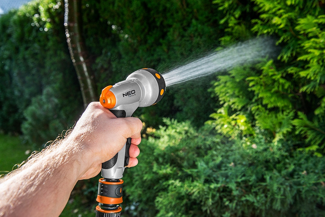 Багатофункціональний дощувач для універсального використання в саду або на присадибній ділянці. Має 7 практичних варіантів регулювання струменя, блокування курка та функцію CLICK. За допомогою повзунка на ручці можна зручно і повністю керовано вмикати і вимикати водяний пучок. Виготовлений з міцних матеріалів, що дозволяє використовувати його протягом багатьох років. Функції поливу дозволяють адаптувати спринклер до ваших поточних потреб: