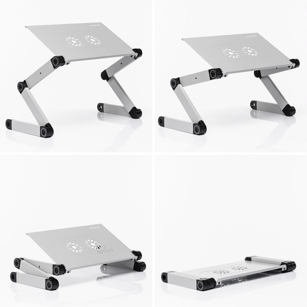 Регульований багатофункціональний стіл, ідеально підходить для роботи з ноутбуком, також підходить для прийому їжі або виступу в якості кафедри тощо. Завдяки складній і регульованій конструкції та універсальності застосування стіл можна використовувати в різних положеннях: на сидінні або на підлозі, лежачи, сидячи або стоячи на стійкій поверхні тощо. Він має окрему підставку для миші та дві 3-точкові шарнірні ніжки, які можна повертати на 360º, завдяки чому регулювання висоти та нахилу дає необмежені можливості повністю адаптуватися до потреб кожного моменту. Основа столу виготовлена з перфорованого алюмінію, який сприяє вентиляції та обмежує нагрів. Продукт містить інструкцію з рекомендованими елементами для різних функцій.