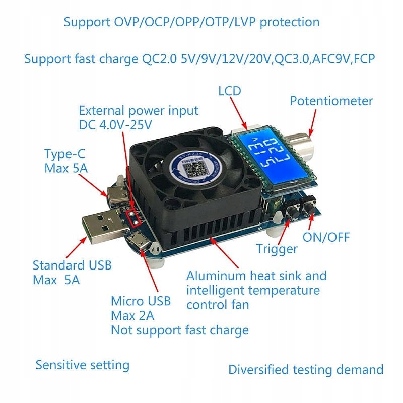 можливість використання та тестування USB -кабелів, USB Micro, USB -типу C, а також можливість підключення зовнішнього джерела без використання USB -кабелів.