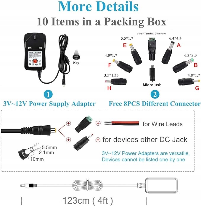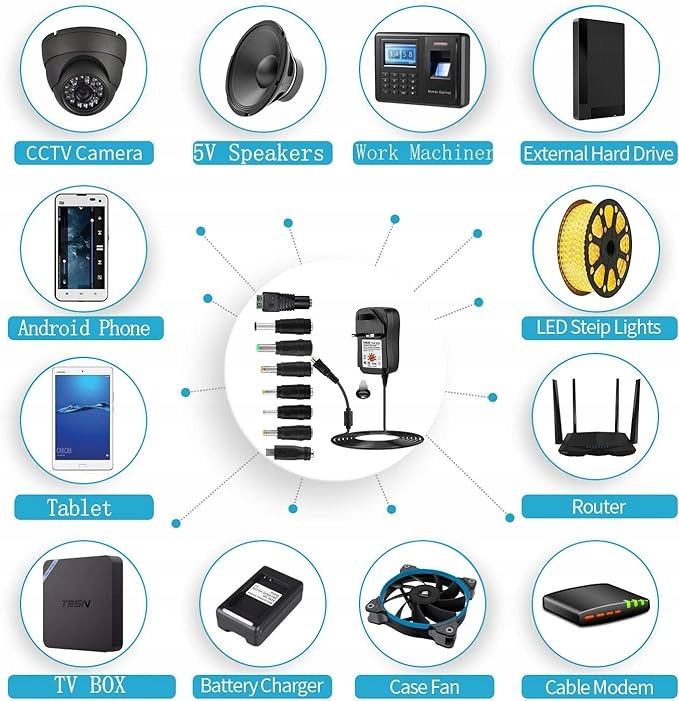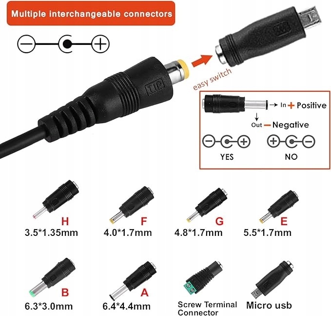- Вхідна напруга змінного струму: 100-240 V ~ 50/60 Гц; Вихідна напруга постійного струму: 3 В / 4,5 В / 5 В / 6 В / 7,5 В / 9 В / 12 В. Вихідний струм: 2,5 А (2500 мА). Вихідна потужність: 6 Вт / 9 Вт / 10 Вт / 12 Вт / 15 Вт / 18 Вт / 24 Вт, Макс 30 століття. Типи невеликої електроніки додому, такі як смартфони, маршрутизатори, динаміки, концентратори, світлодіодні смужки, телекомунікації, T-Com, Speedport, Radioker, Scanner, Switch, Escam QD300, дзвінок тривоги, ручний масажний пристрій та багато інших сумісних пристроїв Електронні, які не були замінені. CM (47,24 дюйма), щоб задовольнити більше вимог до пристроїв, містить безкоштовні 8 різних розмірів взаємозамінних порад. .