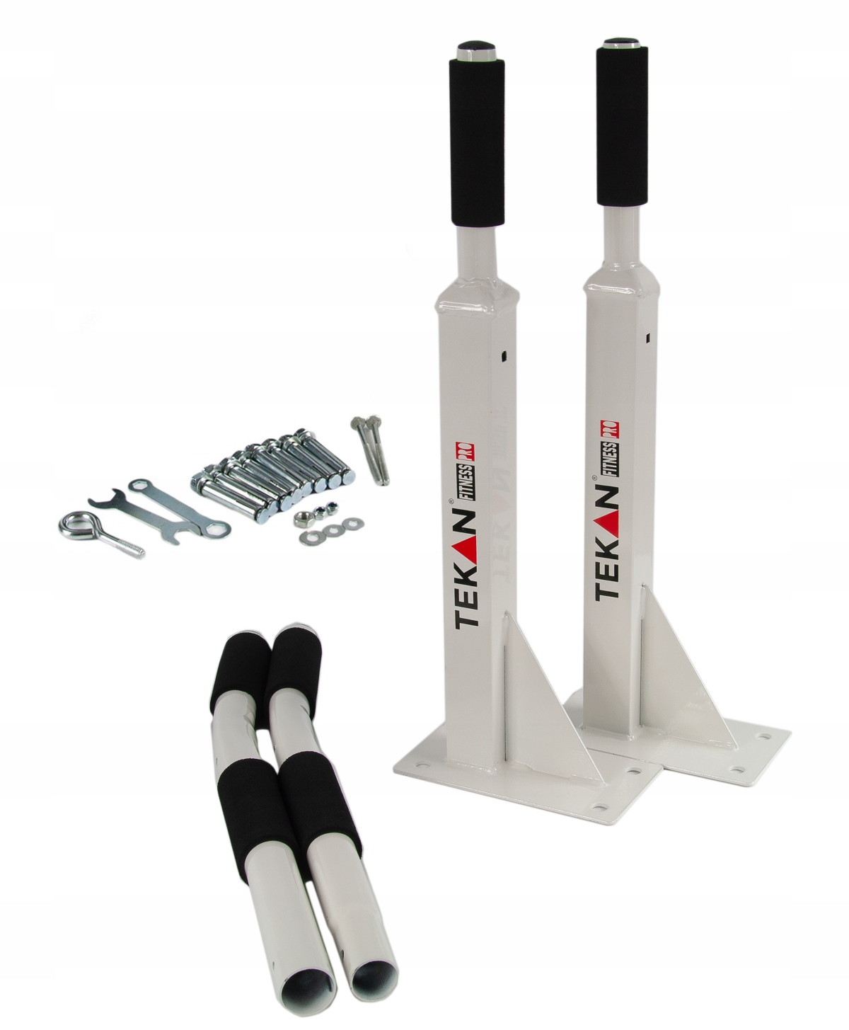 Вся структура TEKAN Поручні Fitness Pro виглядають дуже надійно. Планка упакована в оригінальну коробку виробника, в якій елементи належним чином закріплені під час транспортування. Великий логотип на кожній стороні конструкції прикрашає штангу, а чорні ручки чудово виглядають з білою обробкою. Кожен набір містить елементи кріплення, ключі та просту інструкцію зі складання.
