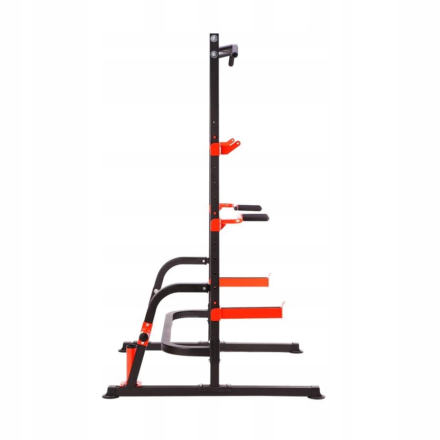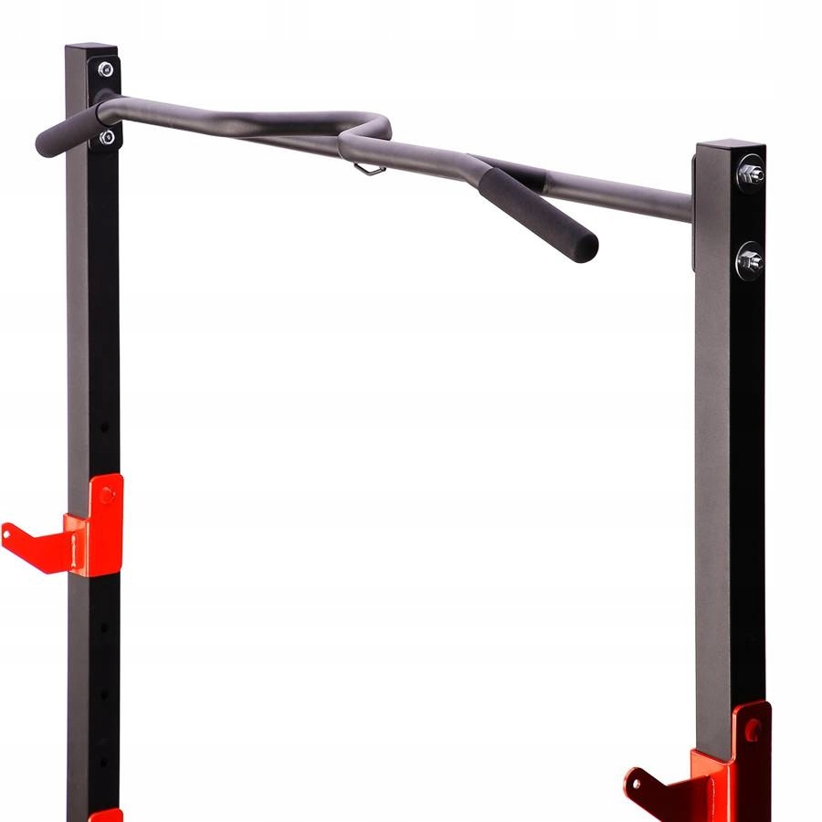 підставка оснащена додатковими гачками для зберігання тарілок і тримачем для шиї. Вони полегшують підтримання порядку в тренажерному залі, зменшують простір, який займає обладнання, і полегшують зміну навантаження на перекладині.