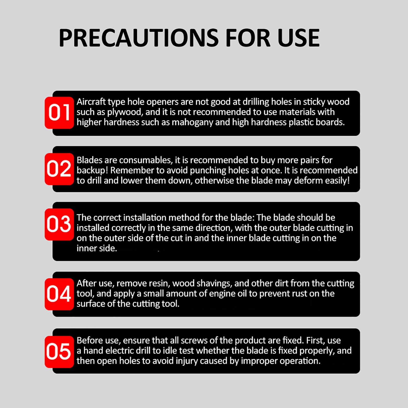 6. Широкий діапазон застосування: використовується для відкриття таких матеріалів, як дерево, пластик, фанера, гіпсокартон, алюмінієво-пластикова плита тощо. ПРИМІТКА: не можна використовувати для таких матеріалів, як метал, шифер, керамічна плитка та скло.