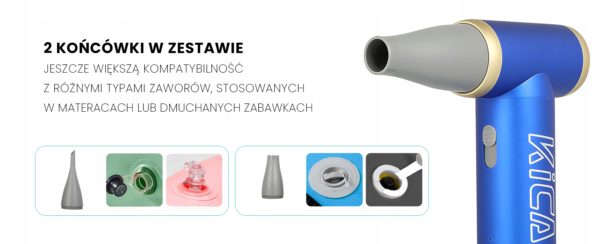У комплекті з багатофункціональною повітродувкою FeiyuTech KiCA JetFan 2 ви отримуєте не одну, а дві насадки, що звужують отвір для виходу повітря. Це забезпечує ще більшу сумісність з різними типами клапанів, які використовуються в матрацах або надувних іграшках. Наконечники виготовлені з міцного і приємного на дотик матеріалу. Суцільна різьба забезпечує міцне з’єднання з повітродувкою.