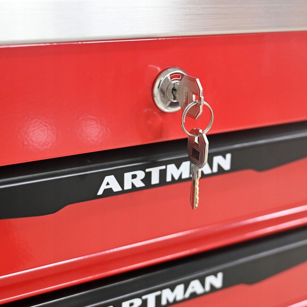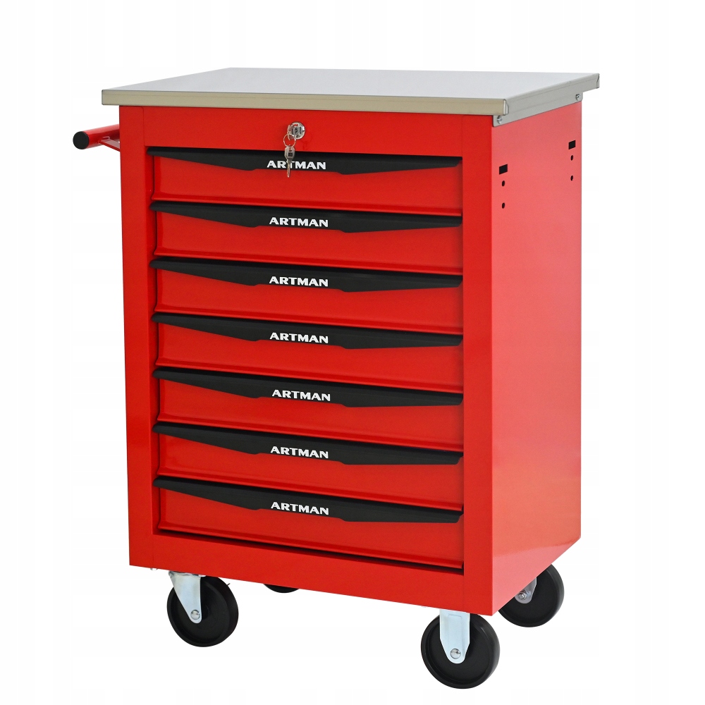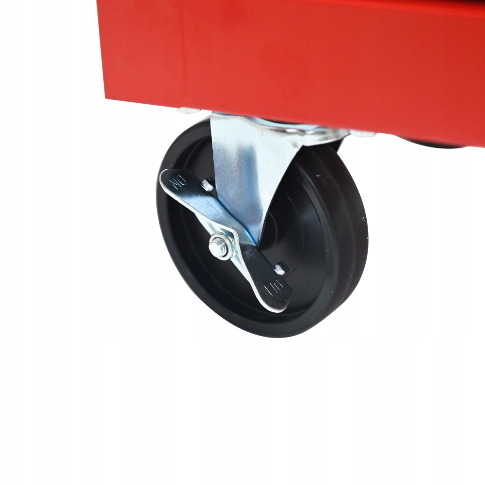 Міцна сталева конструкція з порошковим покриттям забезпечує високу зносостійкість. Набір оснащений чотирма поворотними колесами, два з яких мають гальма, що дозволяє вільно переміщати візок у гаражі або паркувати його у визначеному місці.
