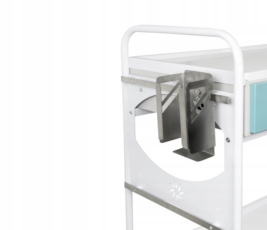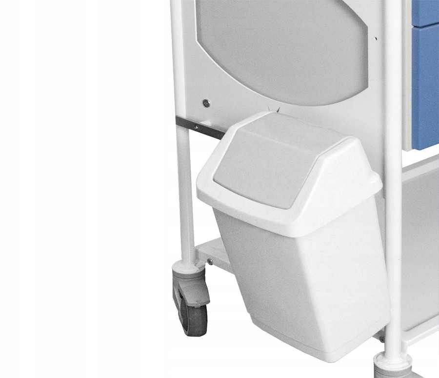 Візок багатофункціональний JUVW призначений для зберігання та транспортування матеріалів і приладів, які використовуються в палатах лікарень. Піддони візка виготовлені зі сталі, покритої порошковою фарбою, стійкою до подряпин. Корпус візка виготовлений з ДСП, а фасади виготовлені з МДФ. Весь він покритий ПВХ шпоном. Візок встановлений на сталевій основі, оснащеній колесами з гальмом. Ящики візка вистелені протиковзким килимком. Стандартно верхні ящики оснащені замком. Система рейок з обох боків коляски дозволяє встановити додаткове обладнання на одну з чотирьох рейок.