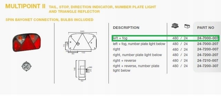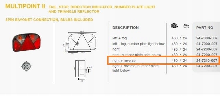 Предметом продажу є оригінальна нова лампа Multipoint II фірми ASPÖCK. Це правий, комбінований ліхтар, який встановлюється як у вантажні, так і в автомобільні причепи, а також евакуатори. Лампа має такі функції як: габаритне світло, покажчик повороту, стоп-сигнал, підсвічування номерного знака, світловідбиваючий трикутник. Лампа має 5-контактний штекер. Розміри 240х140х52