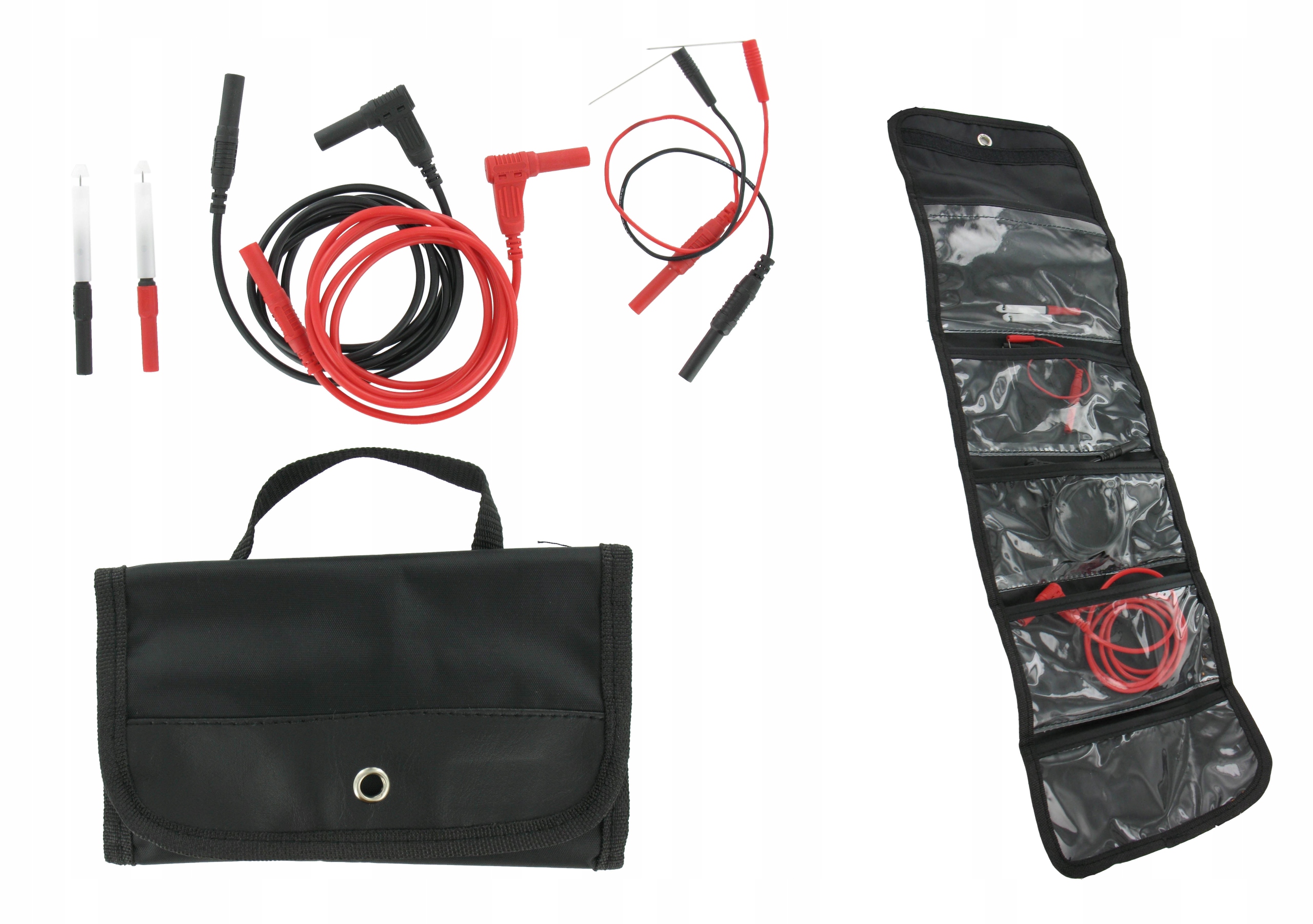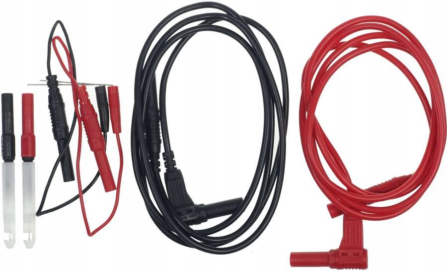 Вимірювальні роз'єми для мультиметрів Hubitools. пара подвійна ізольована силіконова вимірювальна кабела, один кінець закінчився простим, твердим, захищеним вилкою, а другий з кутовою вилкою; Обидва сумісні з усіма стандартними інструментальними розетками 4 мм