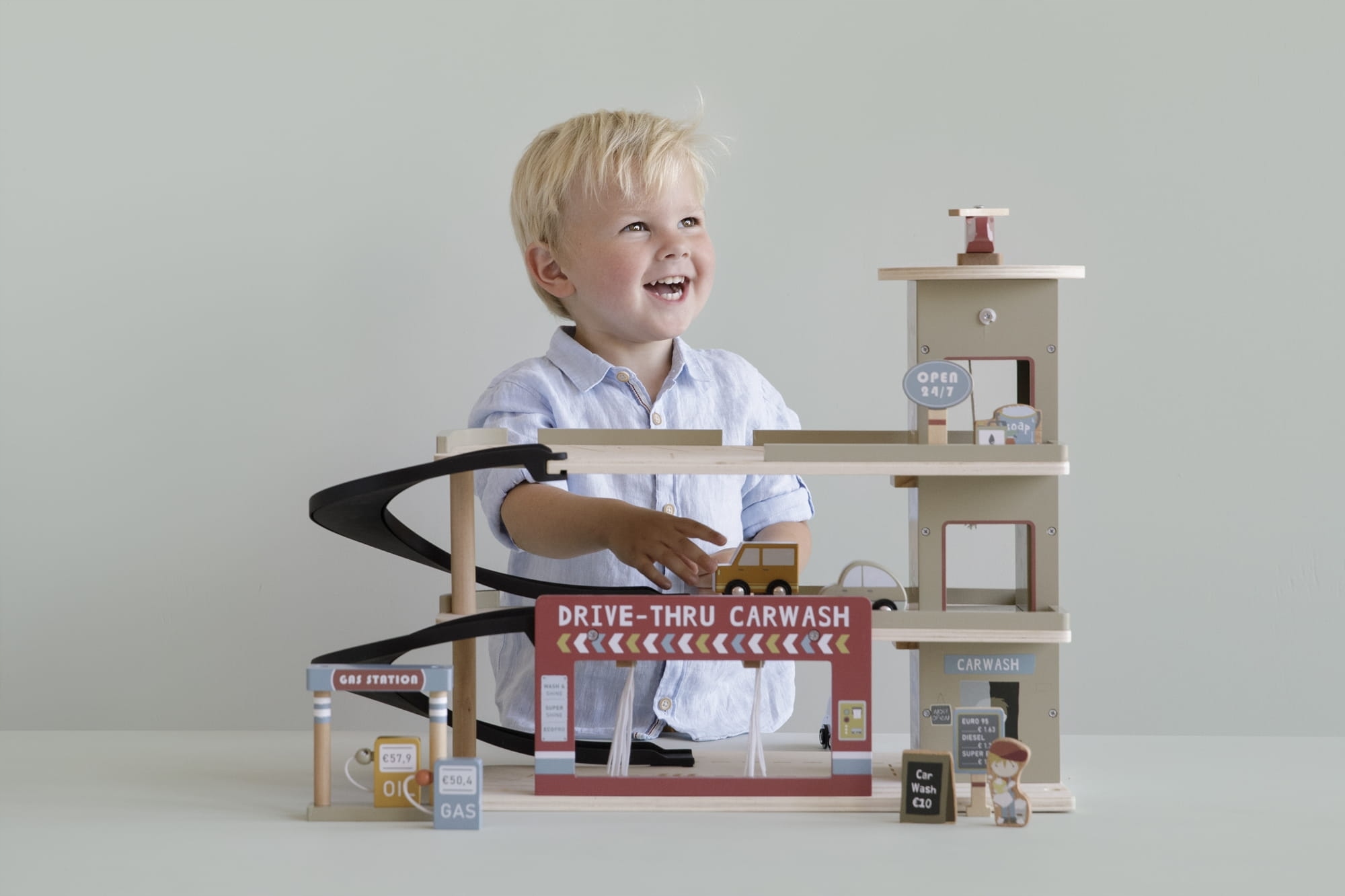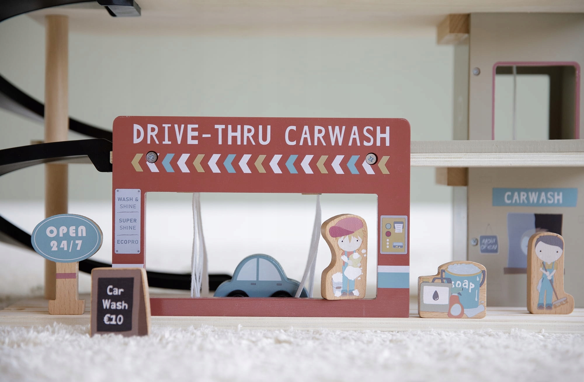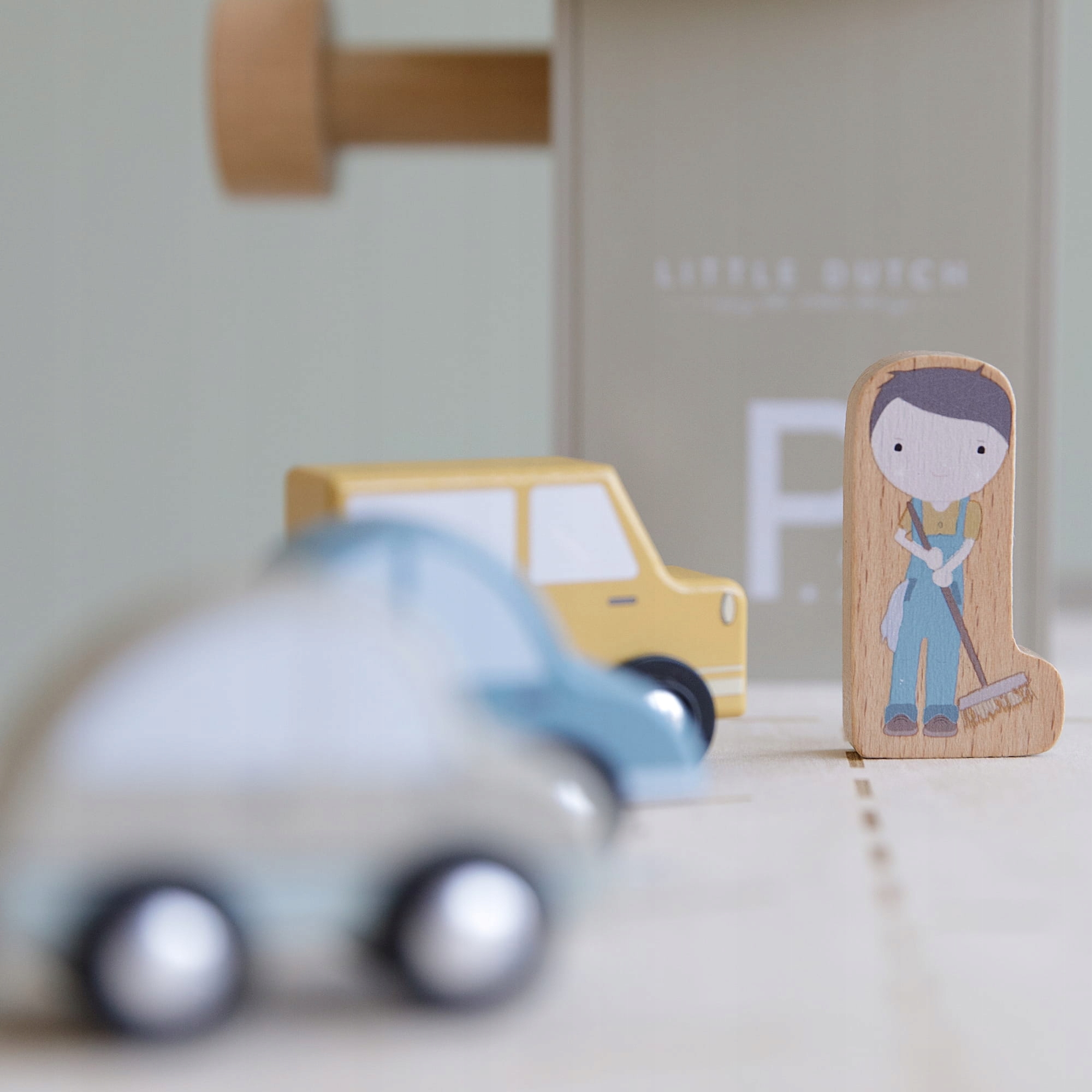 Багатоповерховий гараж Little Dutch — це фантастичний спосіб для довгих годин цікавих розваг. Простий у користуванні автопідйомник піднімає та опускає автомобілі для задоволення. Вертоліт має власну вертолітну платформу, і всі автомобілі можуть бути припарковані на кожному рівні стоянки. У набір входять машинки, вертоліт, знаки та фігурки. Також в гаражі є мийка та АЗС. Фантастичне задоволення гарантовано! Елементи ретельно виготовлені з деревини, сертифікованої FSC (Forest Stewardship Council) і пофарбовані безпечними фарбами на водній основі. Ідеальна ідея для подарунка.