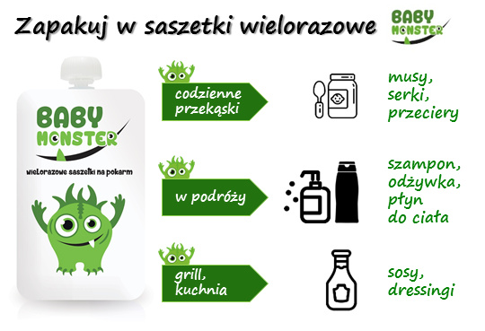 Багаторазові пакетики Baby Monster для зберігання мусів, десертів і домашніх дитячих обідів. Саше загальною ємністю 170 мл.