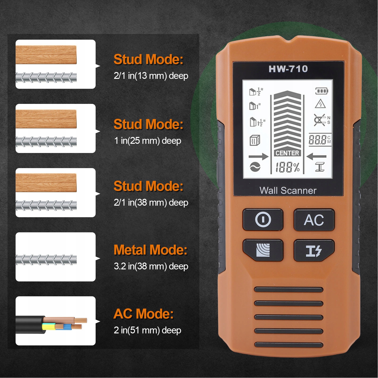 1. Точне позиціонування: цей детектор відмінно справляється з проводами, трубами та шпильками в стінах, підлозі чи стелі, гарантуючи, що ви не пошкодите ключові установки під час свердління.