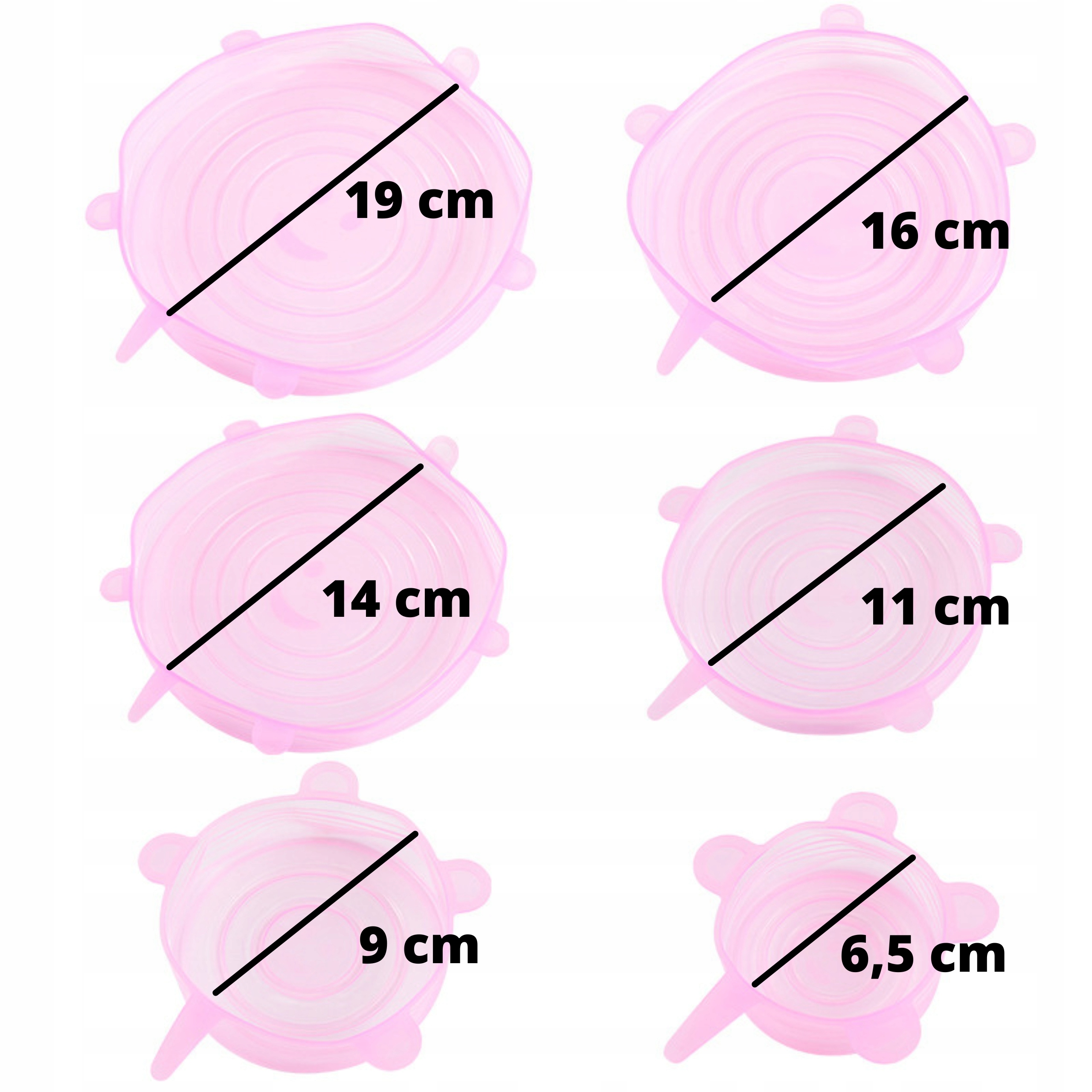 Кришки можна багаторазово використовувати, тобто їх можна мити та використовувати повторно, що не лише корисно для навколишнього середовища, але й економить гроші . У набір входить 6 різних розмірів кришок: 6,5 см, 9 см, 11 см, 14 см, 16 см і 19 см, що робить їх придатними для контейнерів різного розміру .