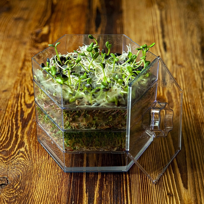 Паростки містять багато вітамінів, зокрема: A, B, C, E і H. Пагони також багаті мінералами: кальцієм, залізом, сіркою, магнієм, калієм, цинком і селеном. Вирощуйте улюблені паростки в затишку свого дому - насолоджуйтеся їх смаком незалежно від пори року! Ви самі вирішуєте, до якого типу культивації приступити - ми надаємо вам пристрій, завдяки якому паростки будуть радувати ваше око та смак вже через кілька днів після посіву насіння (залежно від виду рослини та умов вирощування). Ви можете бути впевнені, що вирощені паростки не будуть містити хімічних сполук і штучних добавок, а їх смак чудово підкреслить апетитний вигляд ваших бутербродів і салатів.