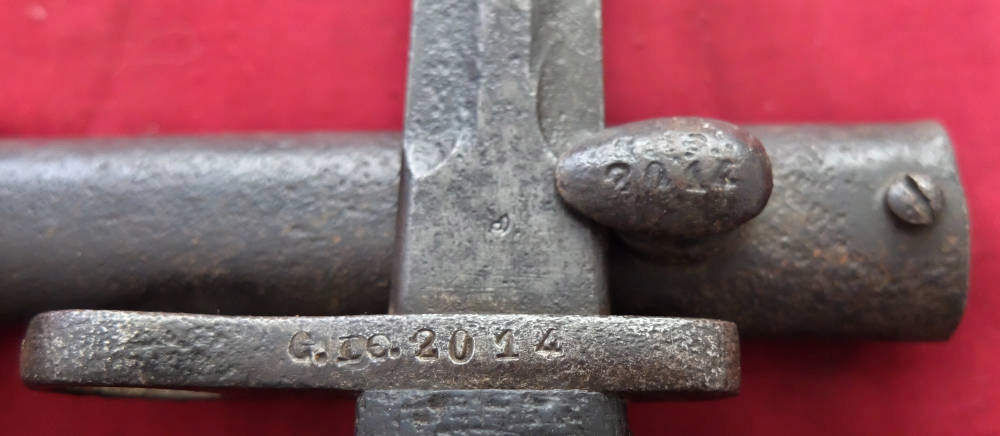 Приклад, який видно на фото, добре зберігся. Багнет і піхви мають відповідні номери, тобто 2014. Клинок незаточений, незаточений, лезо тупе. На поріжку клинка є невелика мітка - літера В. Накладки на ручку оригінальні, дерев'яні. Багнетний замок справний. На цівці видно підписи та вказаний номер 2014.