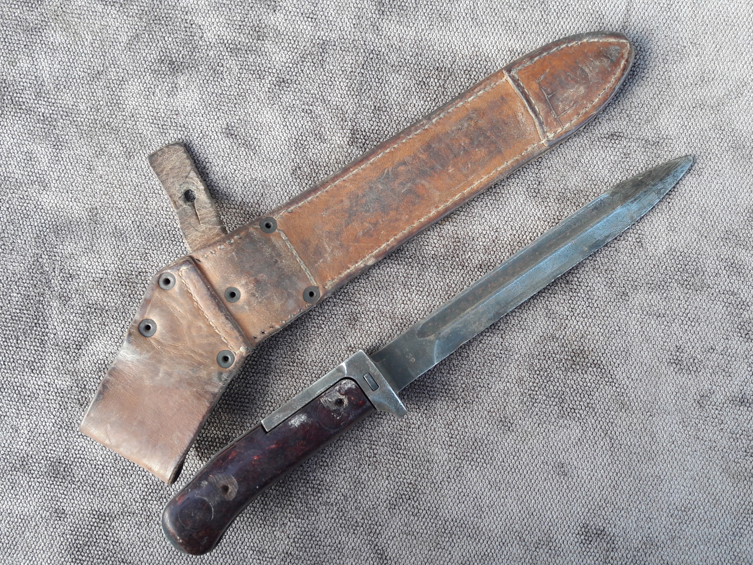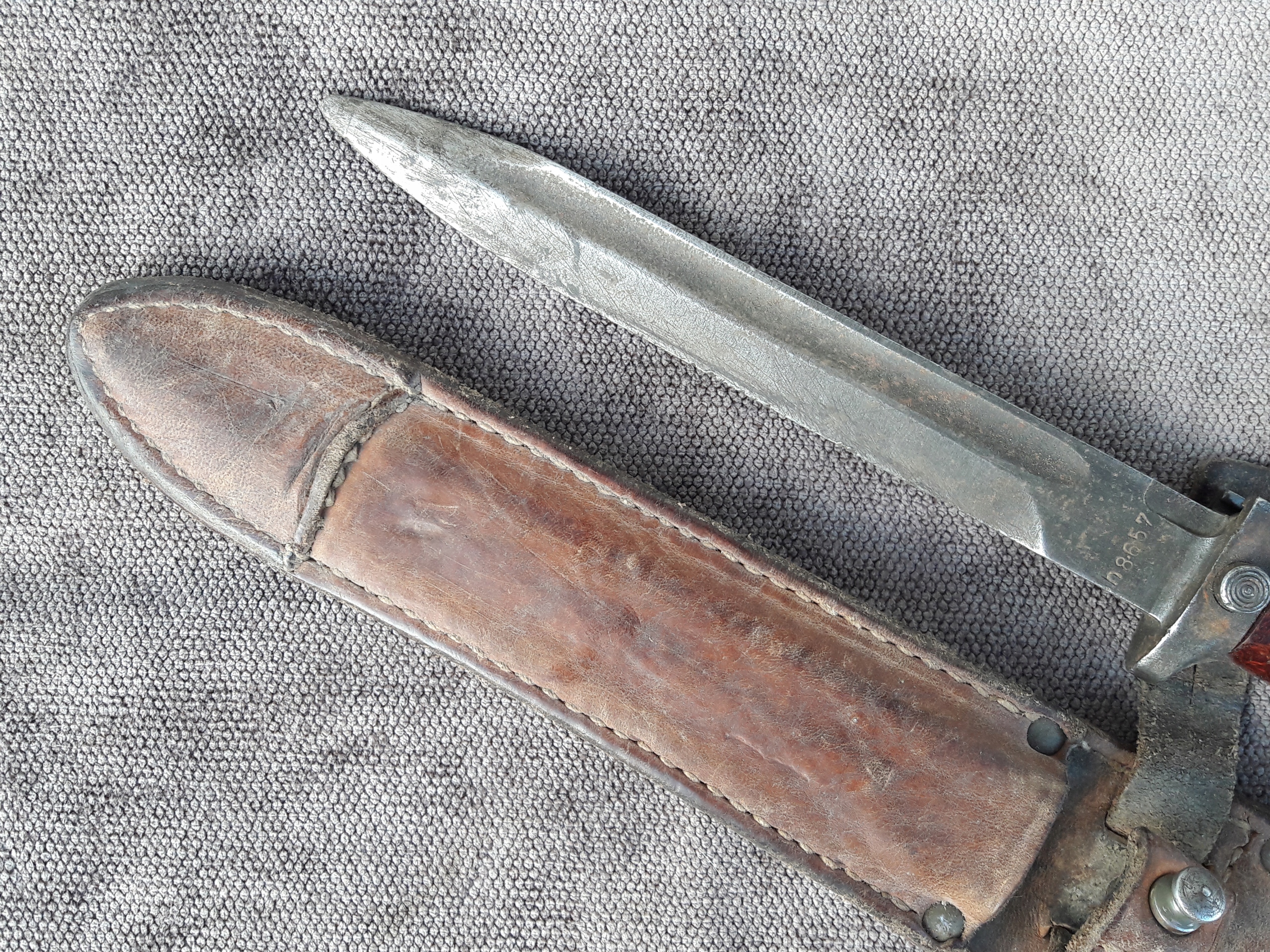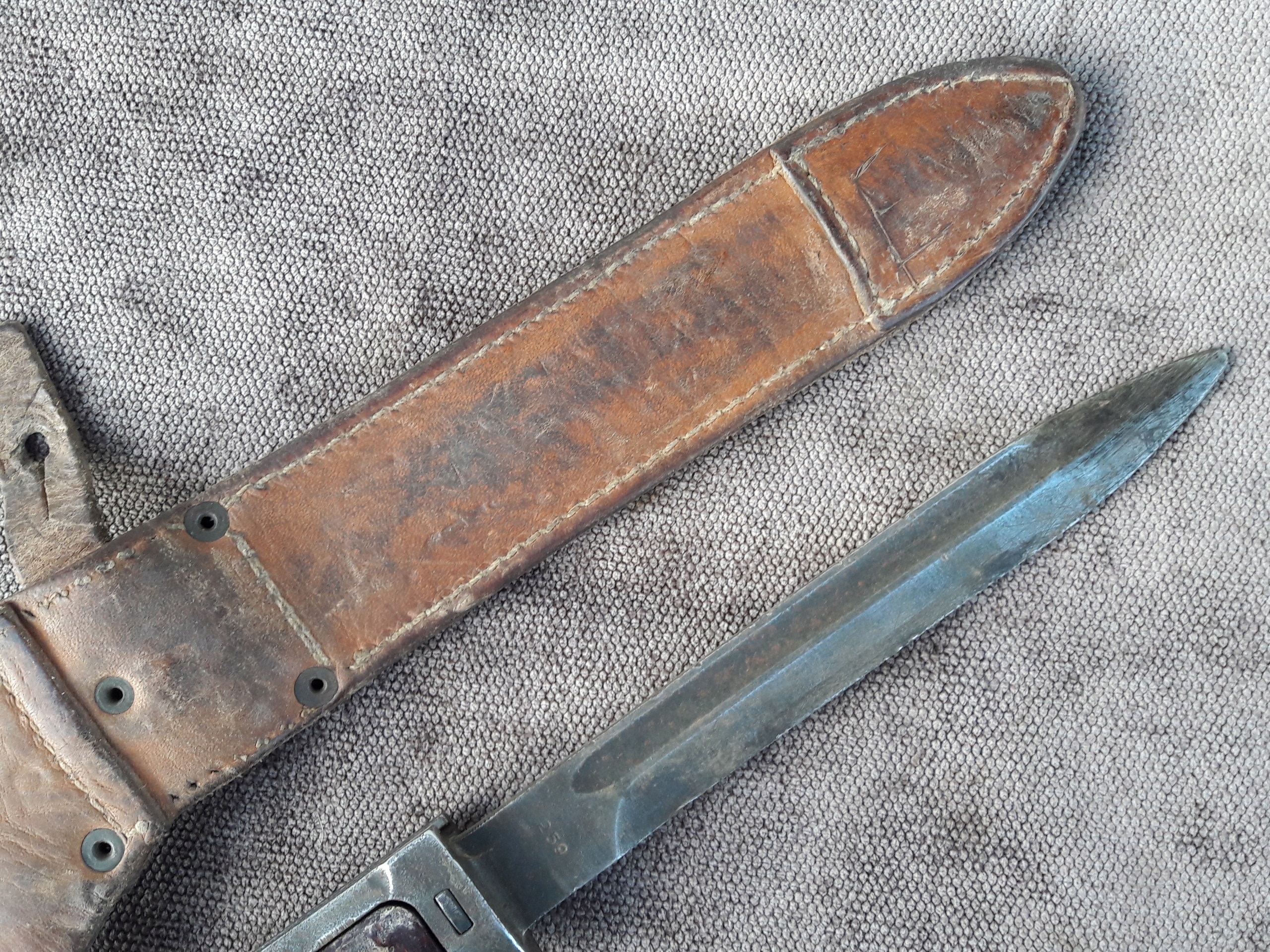 Піхви виготовлені з гладкої шкіри. На клинку є порядкові номери багнета.