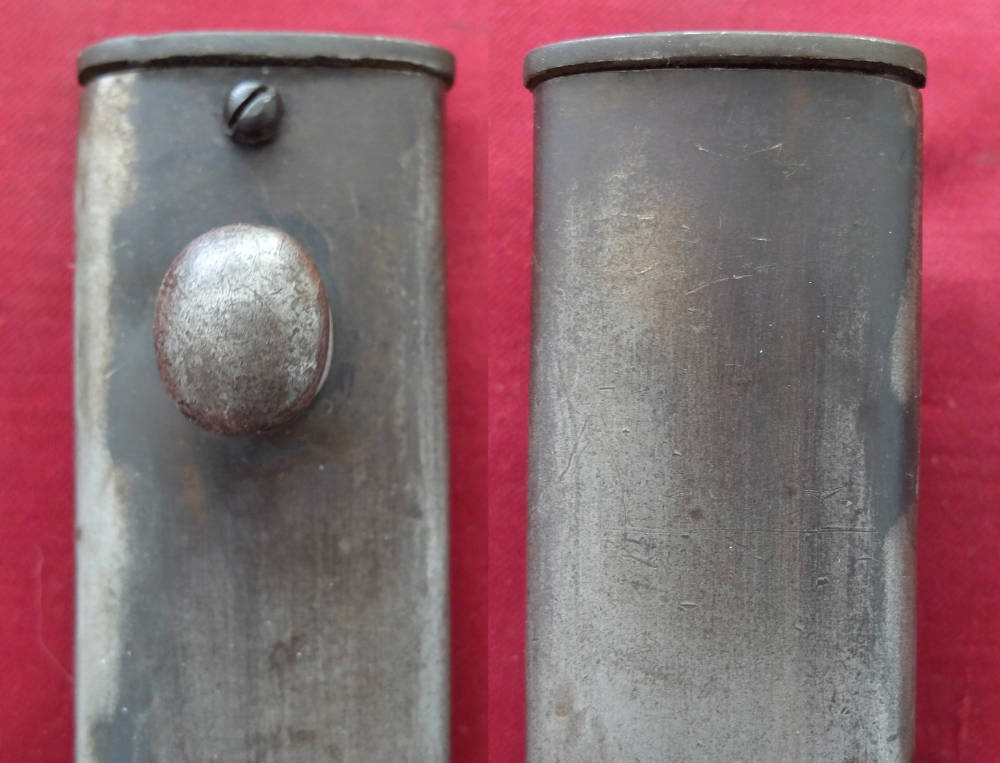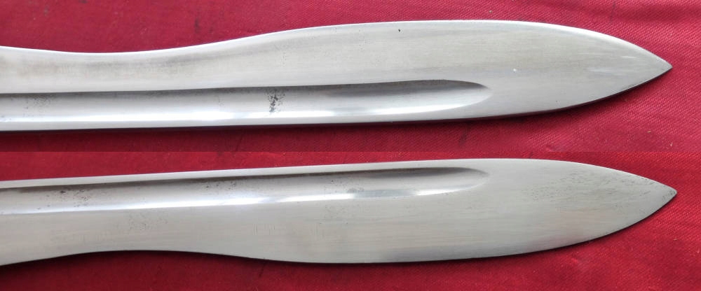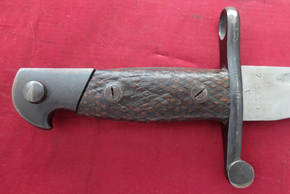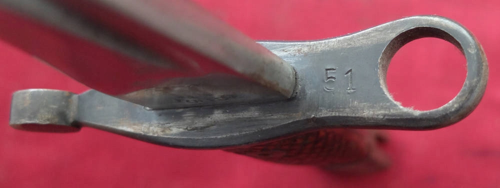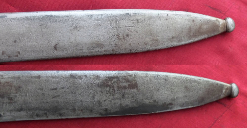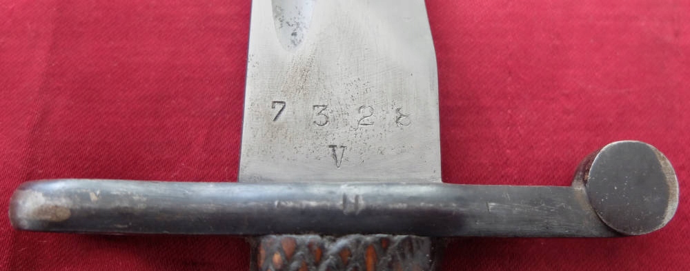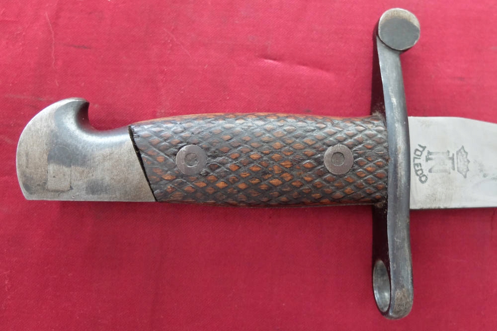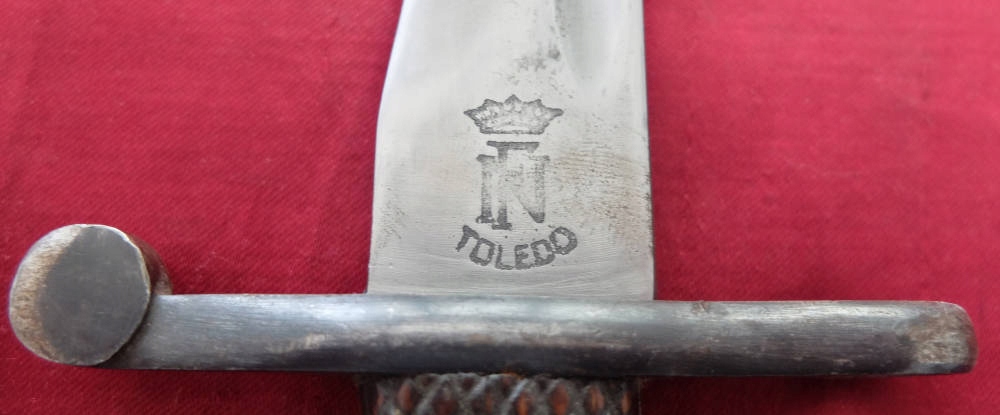 Екземпляр, який видно на фото, добре зберігся. Заточене лезо. Накладки на ручки оригінальні, дерев'яні. Багнетний замок справний. На поріжку леза під короною маркування FN TOLEDO (Fabrica Nationale Toledo), а з іншого боку номер 7328 V.