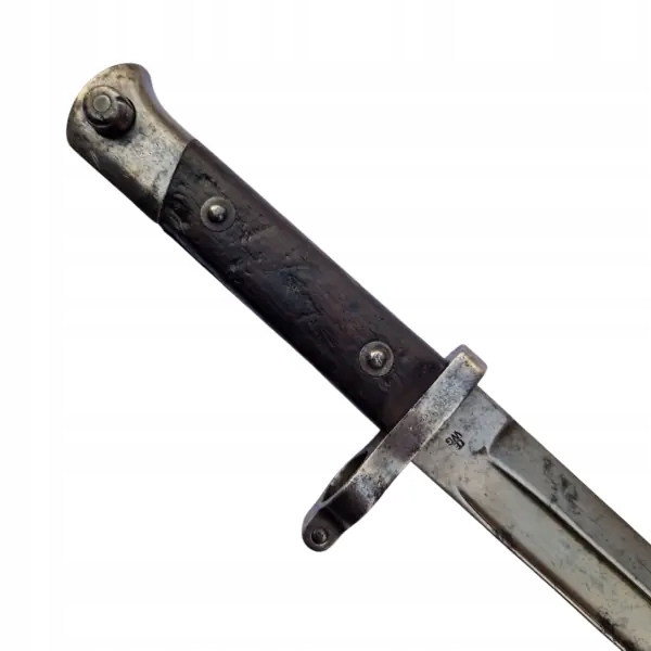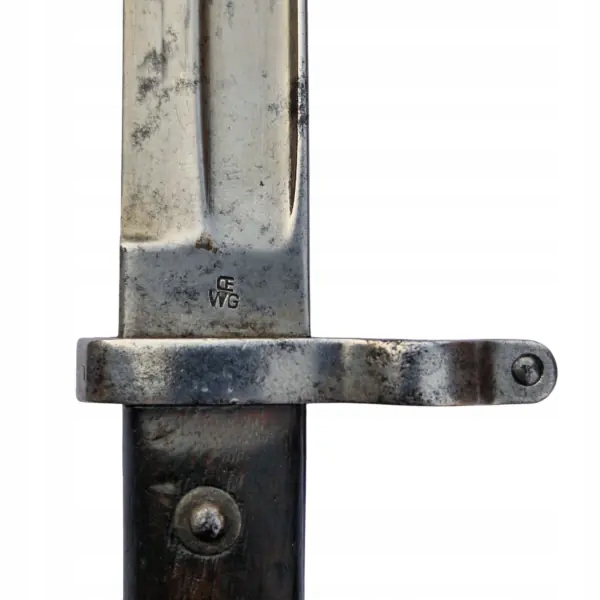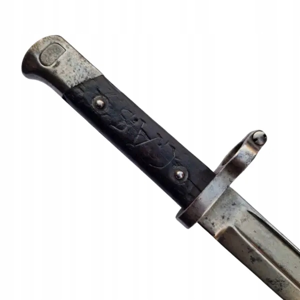 Багнет Mannlicher, модель 1886, досить рідкісний солдатський багнет у хорошому + стані, піхви не пом’яті, багнет і піхви без будь-яких слідів сьогоднішнього втручання, багнет виробництва OEWG-Steyr, напис періоду вигравіруваний на кришці руків’я; C.A.S. , багнет зразка 1890/95 відрізнявся від багнета зразка 1886 лише діаметром кільця цівки, показаний багнет має діаметр 17,5 мм, що вказує на те, що це старший зразок 1886.