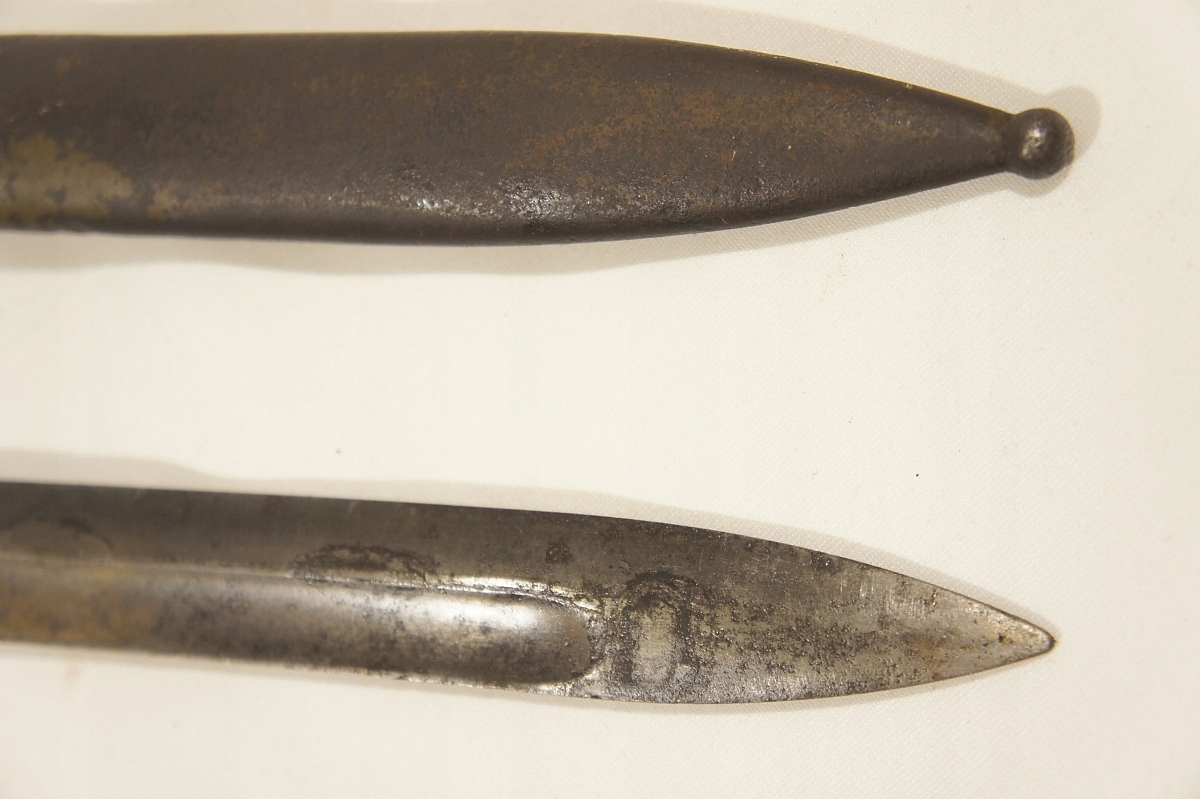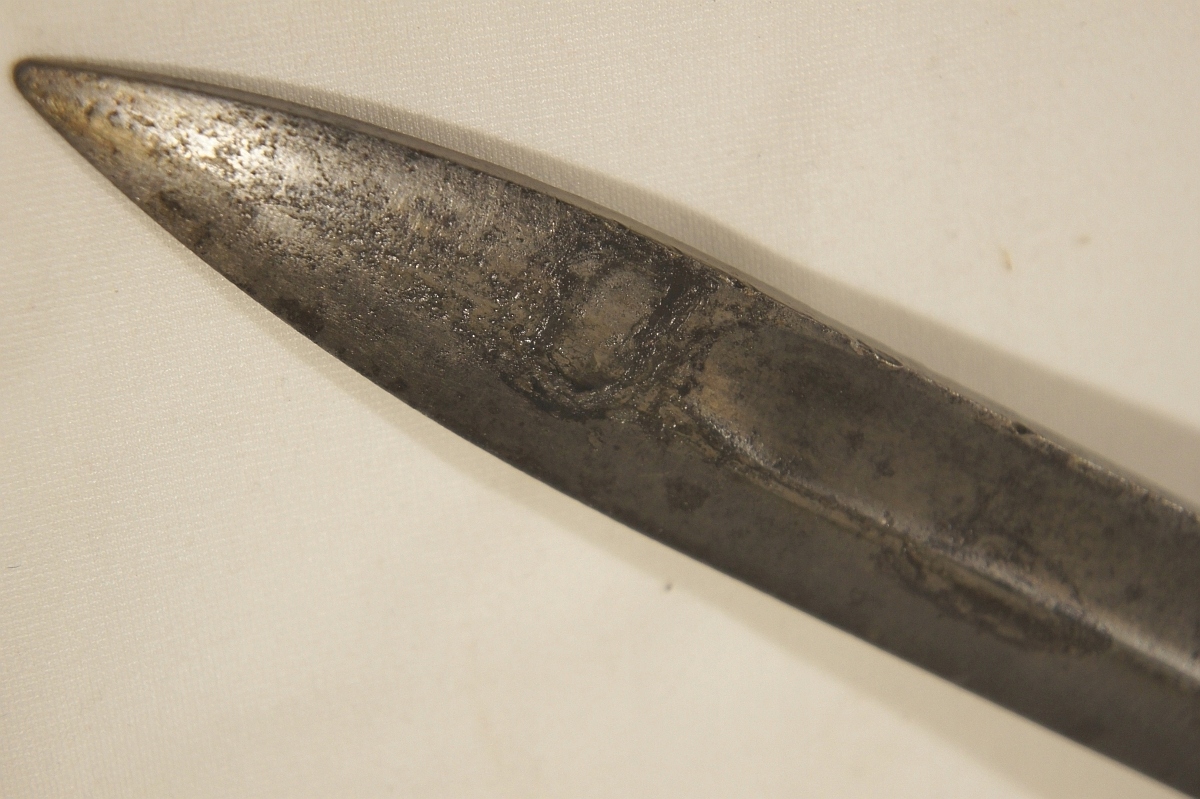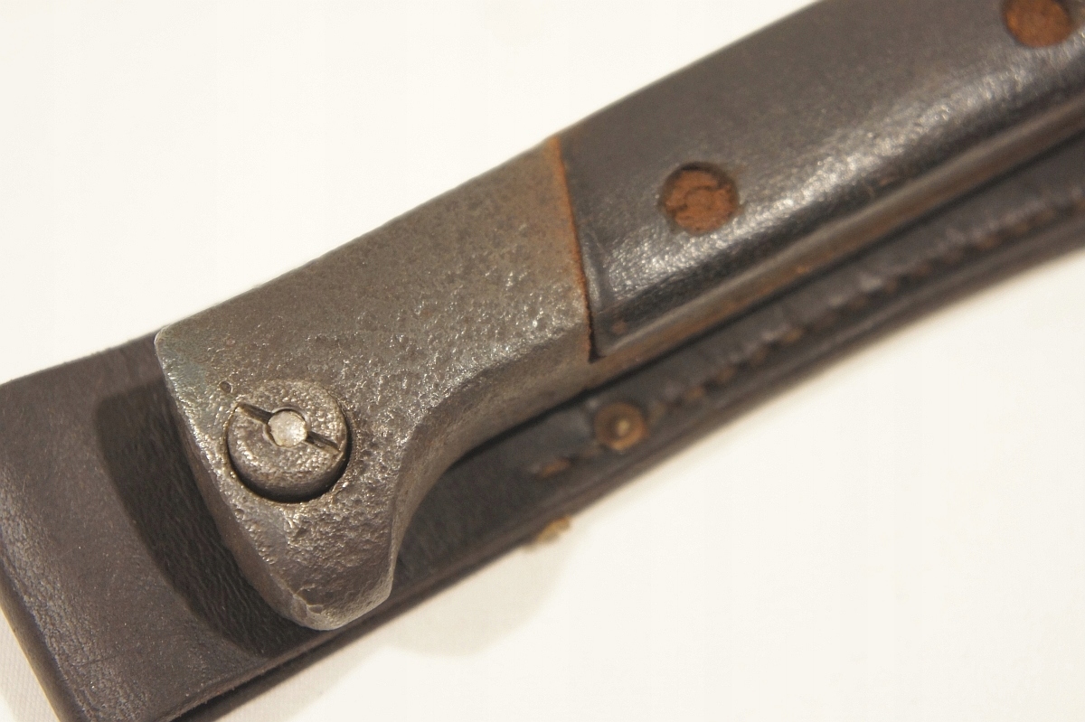 Літера "М" у трикутнику з правого боку Напис ПЕРКУН - військова прийомка. Зліва від напису ПЕРКУН - клеймо техогляду, З ЛІВОГО БОКУ ВИДНА ЗАКЛЕПКА в трикутнику МОЖЛИВО на зворотному боці видно літери W. p. під польським орлом IIRPNA. СЕРІЙНІ НОМЕРИ, ВІДШТАПОВАНІ НА РУКАХ, ВИДАЄТЬСЯ З ПОЧАТКУ СЕРІЇ, З ІНШОГО БОКУ НА РУЧКІ, В ПРЯМОКУТНИКУ МІЖ ЗАКЛЕПКАМИ ВИДИТЬСЯ ДЕЯКАСЬ ЛІТЕРА механізм засувки справний, піхви з видимими слідами зеленої фарби, ШКІРА ЖАБА