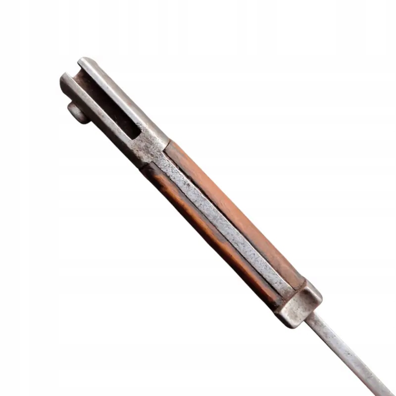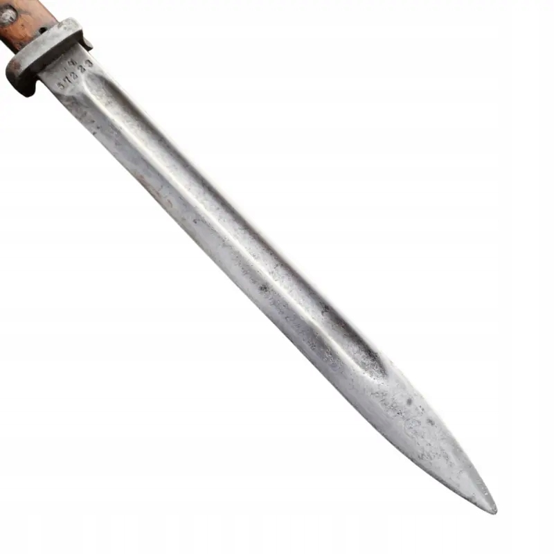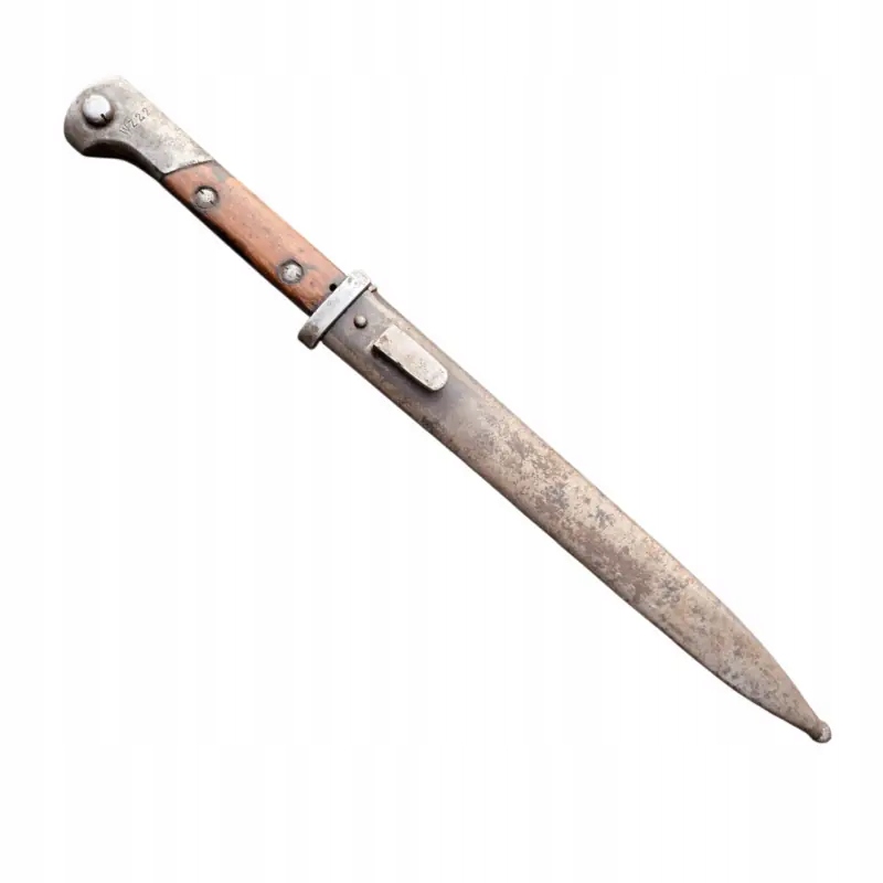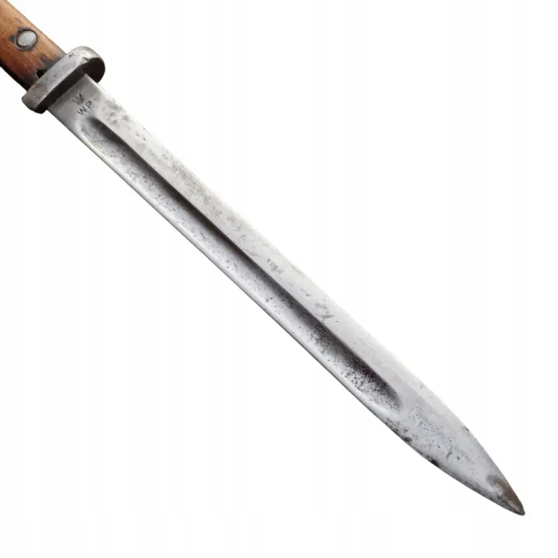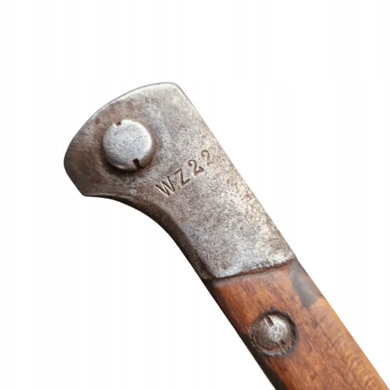 Польський багнет WZ 22 Краківської зброярні, багнет в дуже гарному стані з середини виробничої серії Краківської збройової палати, ручка в натуральному стані, наконечник клинка і лезо злегка відполіровані, здається, що в епоху? тому що на слідах шліфування є невеликі сліди пізнішого використання, згідно з описом книги Януша Ярославського «Багнети Війська Польського» цитата: «Чипки, які згідно з технічними умовами повинні бути виготовлені з букового дерева, зброярня виготовлена зі старих, зруйнованих рушничних лож», часто зроблена з волоського горіха, тому один із багнетів зброярні №. 4 в нашому магазині є чохли з горіха, а в запропонованому тут чохли з бука. Сталь, використана для виготовлення леза, була неоднорідною, тому зовнішній вигляд леза був схожий на корозію, але це результат використання неякісної сталі. Багнет у хорошому+ стані для цього типу багнета.