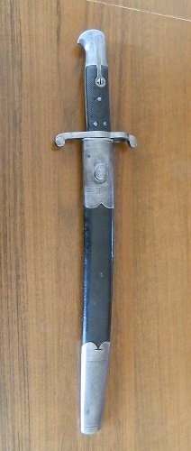 Штик-нож для артилерійської гвинтівки Martini Henry. Ручка з рифленими чорними шкіряними кришками, прикріплена з правого боку трьома заклепками та гвинтом, який також кріпить плоску пружину засувки, і чотирма заклепками з лівого боку. Ців'я з дульним кільцем. Сталева головка з кнопкою блокування. На головці поруч із плоскою пружиною вибита цифра «13». Поперечина пряма з кільцем. Літери «J.R» вибиті на тильній стороні ручки та «E 20 S» біля навершя під короною. Однолезовий клинок з центральним вістрям. На поріжку клинка з одного боку вибите клеймо 7'98, поруч під вінцем цифра «34» над літерою «Е». З іншого боку стрілка з літерами «WD» і під нею літера «E» в короні, 9 і літера «S». Чорні шкіряні піхви зі сталевою фурнітурою. На шийці піхви є виступаючий грибок для прикріплення жаби. Шви цілі. Дуже рідкісний оригінал, повна копія з піхвами та цікавими позначками. На фото все видно.
