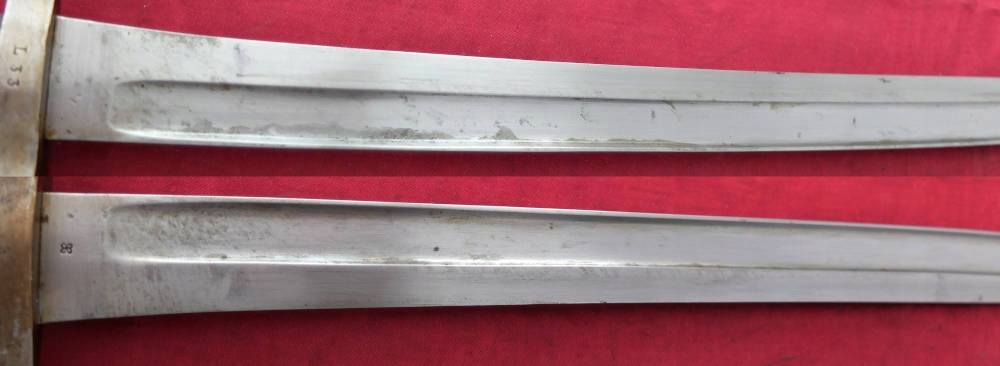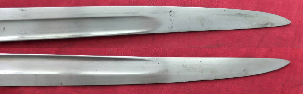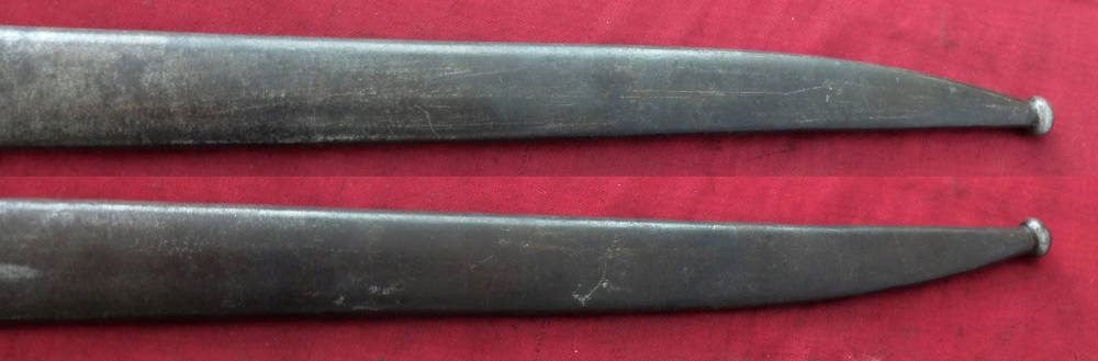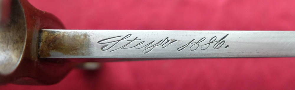 Копія, яку видно на фотографіях, дуже добре збереглася. Клинок типу ятагана, незаточений і незаточений. На порозі леза є невеликий слід. На тильній стороні клинка напис Steyr і рік виробництва 1886. На хрестовині вибиті номер L 33 і маленький підпис. Накладки на ручки дерев'яні, оригінальні. Багнетний замок працює.