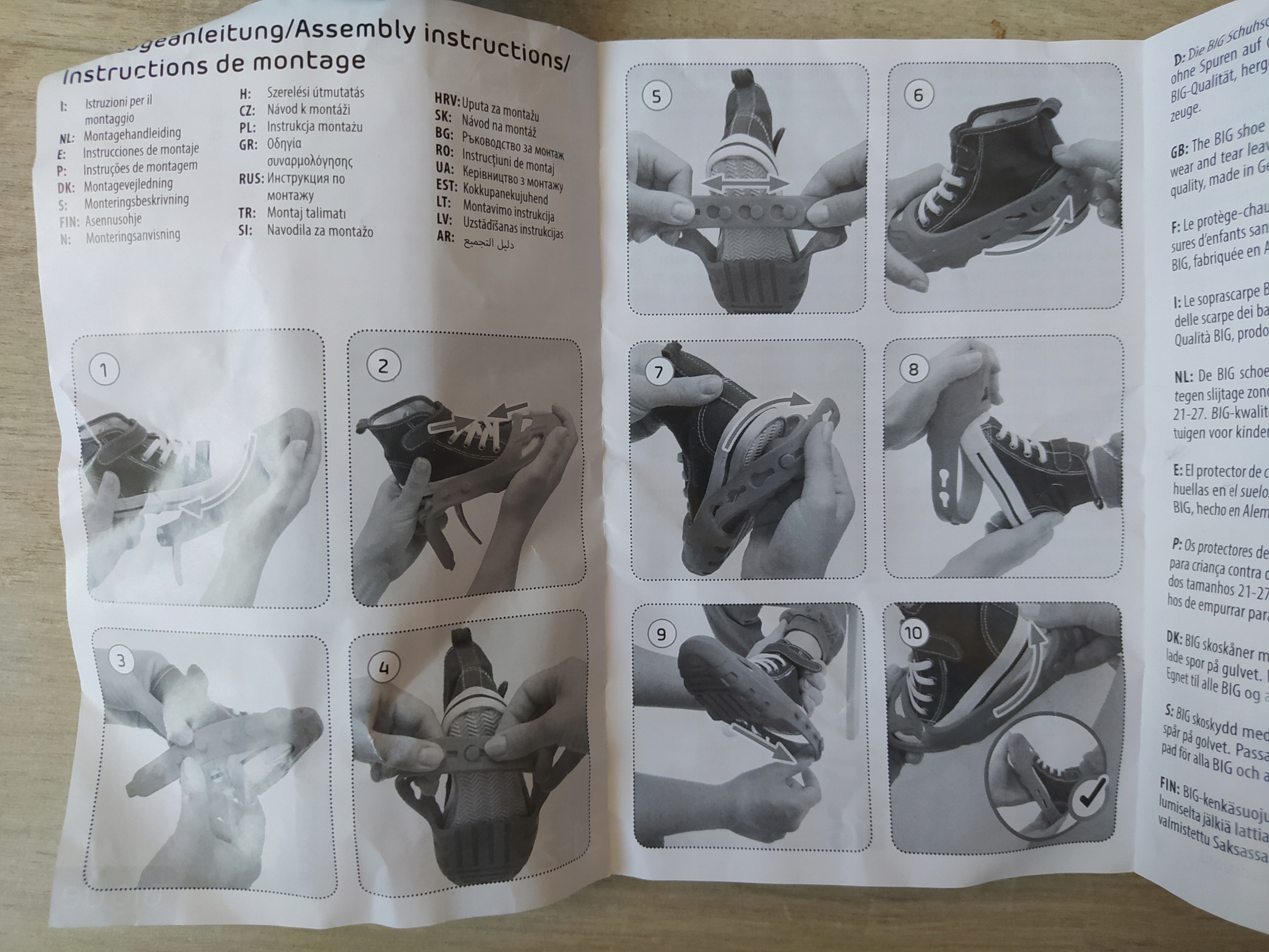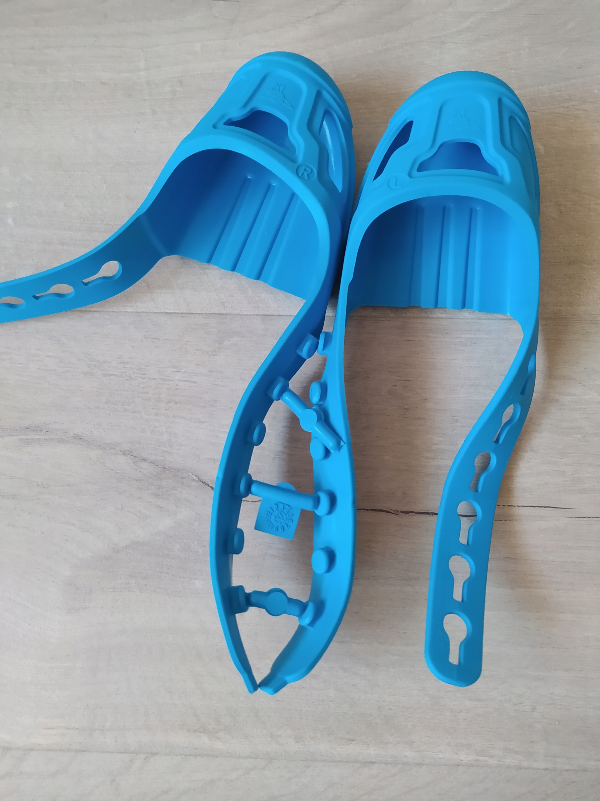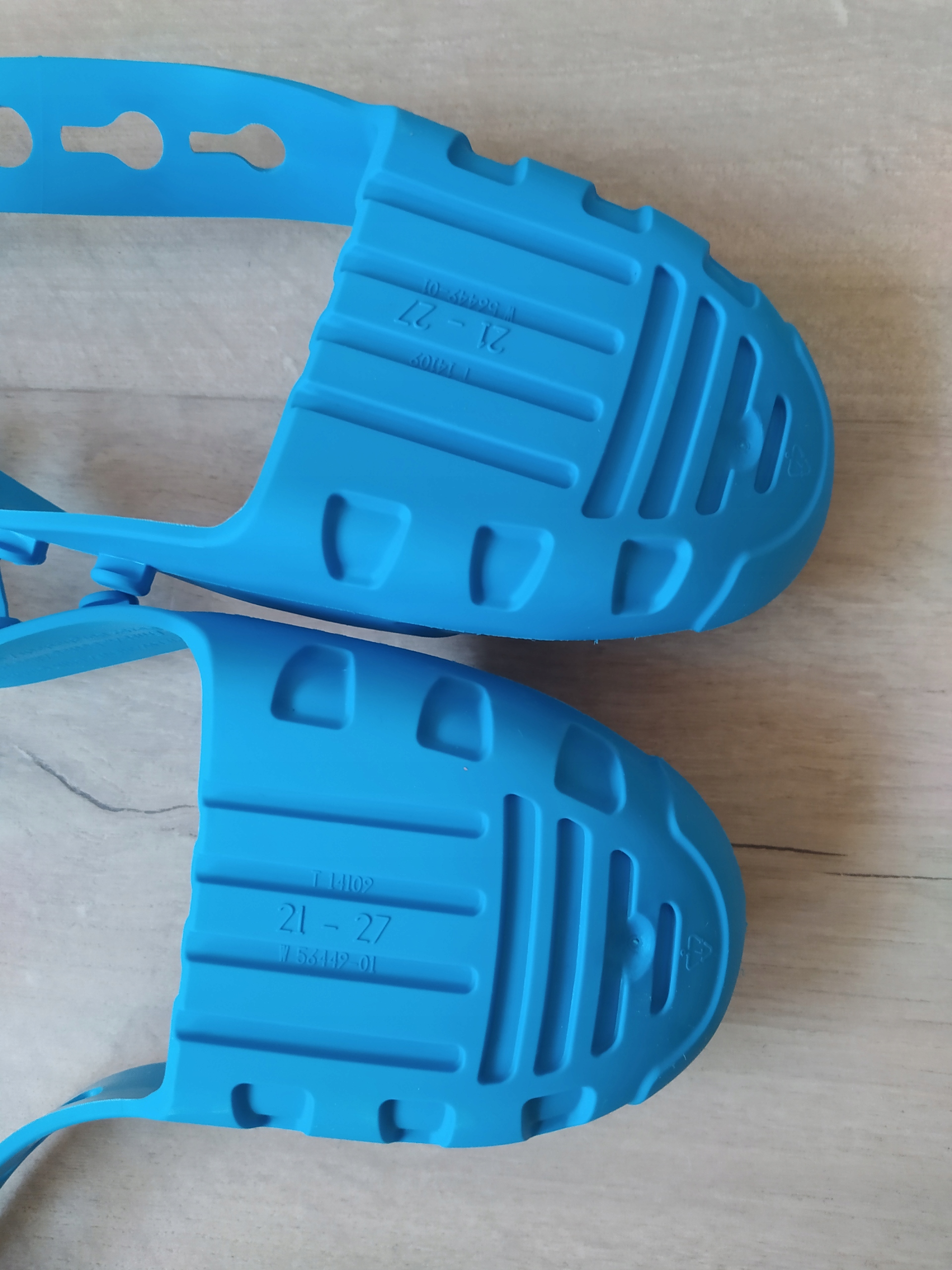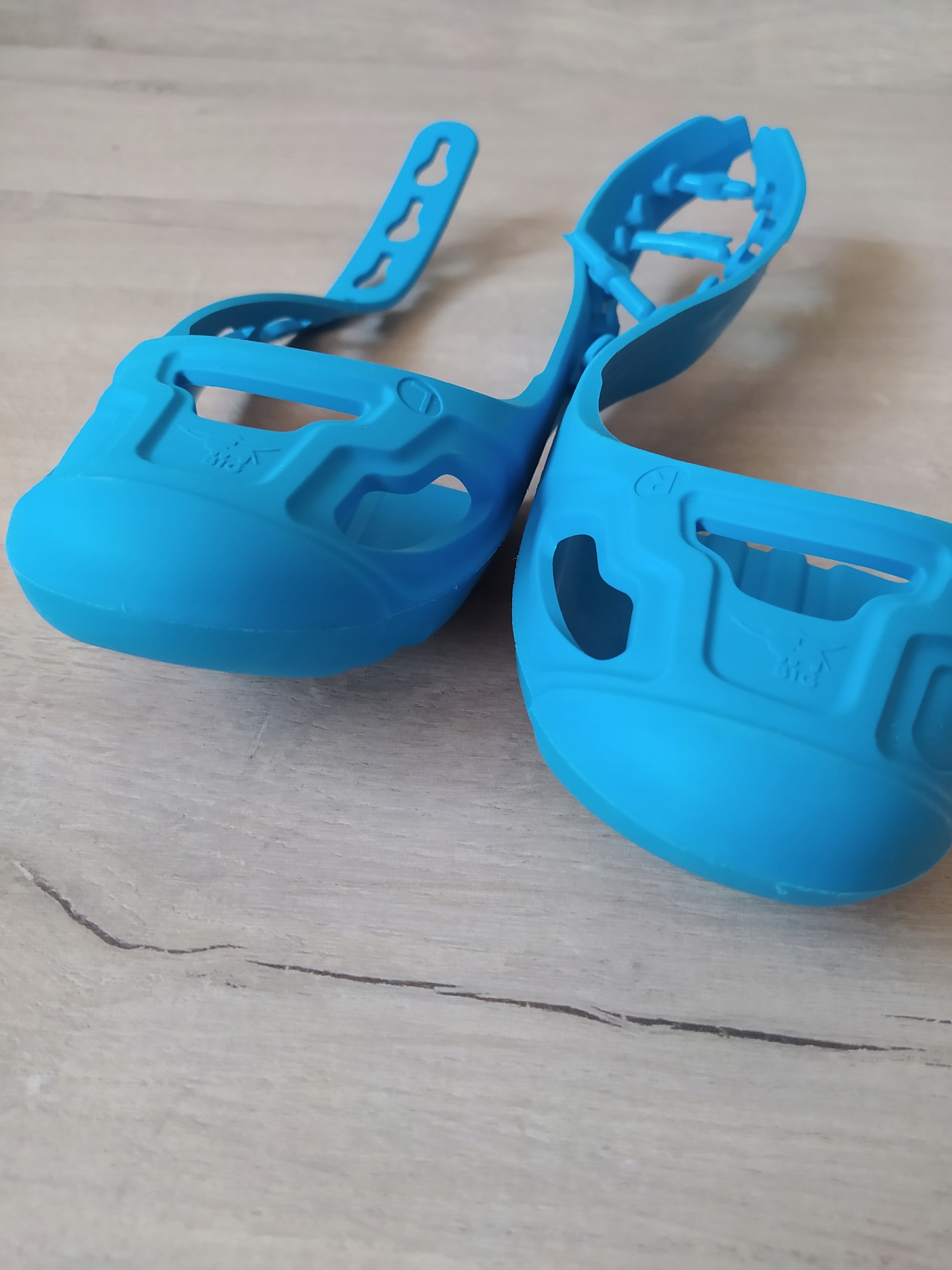 Рекомендація: спочатку покладіть обидва бічні виступи один на одного, щоб побачити, яка застібка потрібна для регулювання розміру. Потім зніміть протектор і просто натисніть на відповідні засувки. Тільки після цього натягніть протектор на взуття дитини (надіньте його спереду, а потім потягніть).