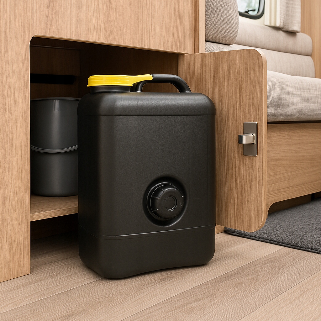 Резервуар використовується як ємність для стічної води з умивальника, душу або раковини в кемперах і караванах. Його можна підключити безпосередньо до системи водопостачання за допомогою гнучкого зливного шланга. Він також підходить для мобільних додатків - напр. на ділянках, човнах, мобільних точках громадського харчування чи портативних автомийках.