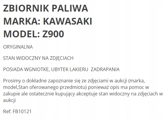 Просматривая «Bak Kawasaki Z900 Топливный бак», вы можете быть уверены, что данный товар из каталога «[rubrica_name]» будет доставлен из Польши и проверен на целостность. В цене товара, указанной на сайте, учтена доставка из Польши. Внимание!!! Товары для Евросоюза, согласно законодательству стран Евросоюза, могут отличаться упаковкой или наполнением.