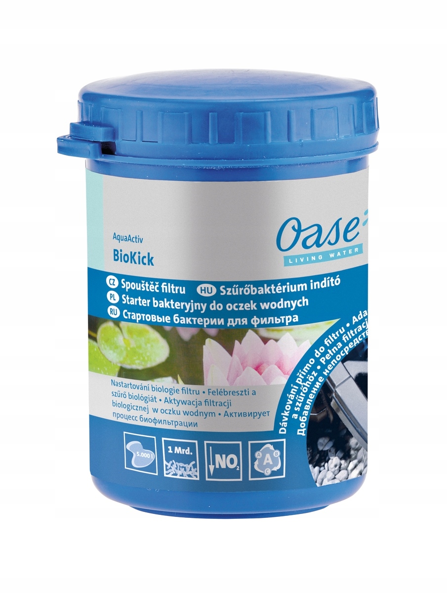 Висококонцентровані стартові бактерії Oase AquaActive BioKick активують біологію садового ставка під час першого запуску фільтра або навесні. Понад 10 мільйонів активних мікроорганізмів прискорюють заселення ваших фільтруючих губок цінними бактеріями. З цим стартером ваш фільтр садового ставка досягне повної ефективності протягом кількох тижнів.