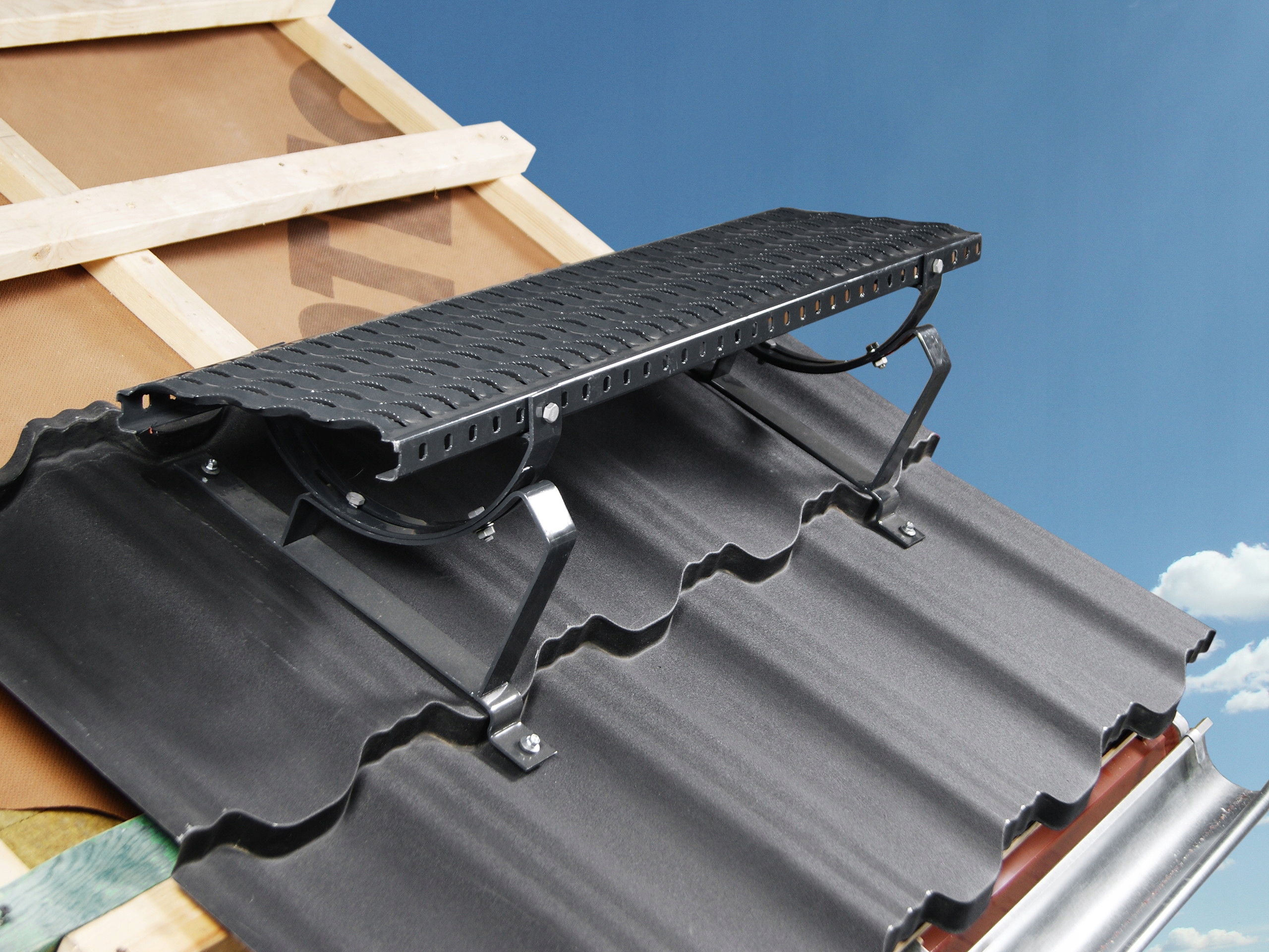 Застосування: Лавки та сходинки для сажотруса використовуються для безпечного та комфортного пересування по похилій поверхні даху. Найчастіше використовується для зв’язку між люком на даху та пристроями, які потребують технічного обслуговування або обслуговування на даху, наприклад димоходами, антенами або сонячними системами. Правильно підібрані елементи системи дозволяють переміщатися вздовж схилу ската даху (горизонтально) і поперек ската даху (вертикально).