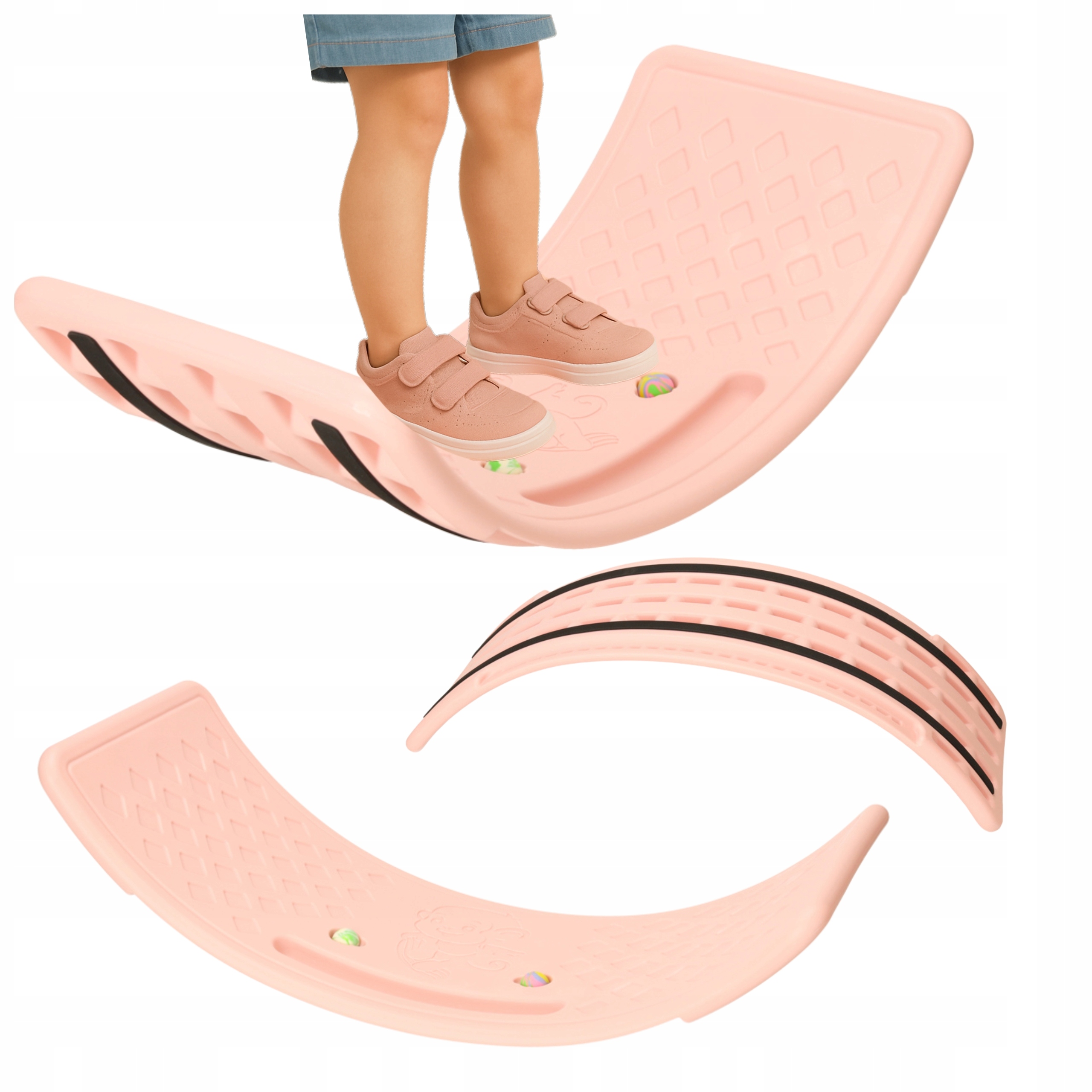 Рожева балансборд - ідеальна пропозиція для дітей, які люблять рух і виклики. Завдяки нековзким смугам і заокругленим краям гра абсолютно безпечна. У набір входять два гумові м'ячі, які можна рухати під час розгойдування, що додатково задіює та розвиває моторну координацію та рівновагу. Дошка може виконувати різні функції - від класичної гойдалки до креативного містка для іграшок.