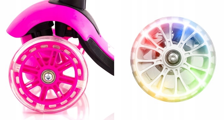 - самокат має вбудовану динамо - завдяки якій колеса підсвічуються під час їзди