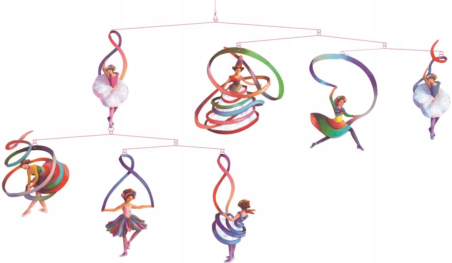 Мобіль із зображенням чарівних танцівниць, які крутяться зі стрічками. Декоративний аксесуар розміром 60х54 см для спальні або дитячої кімнати.