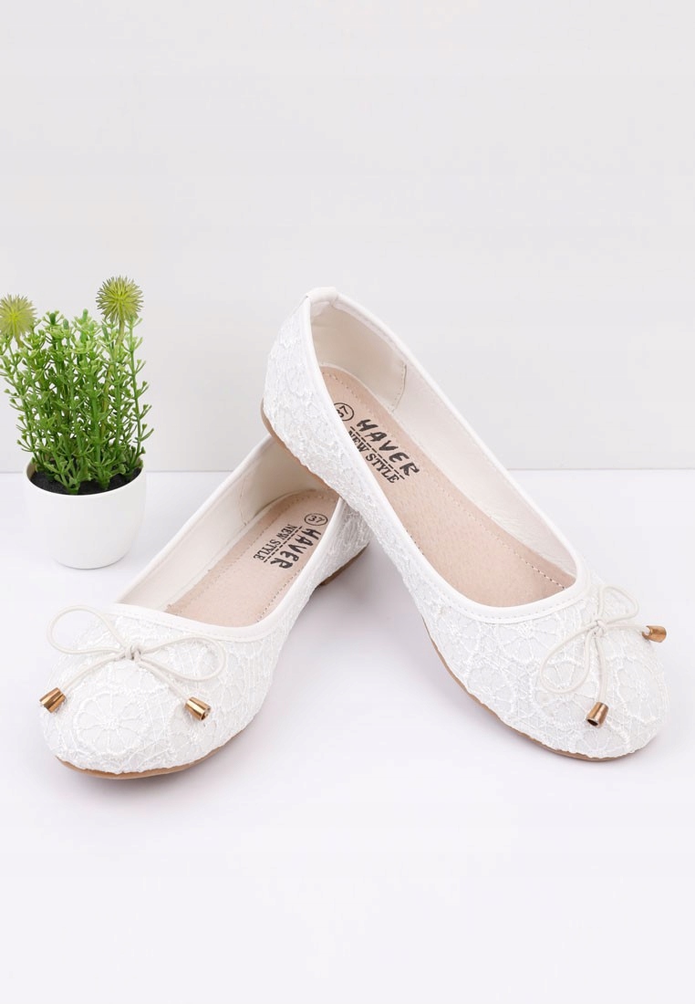 Балетки для дівчинки на плоскій підошві. Прикрашений спереду невеликим бантом із гукмі. Виготовлений з матеріалу, покритого мереживом. Круглий ніс, сліпони. Носити витончені балетки можна з багатьма фасонами.