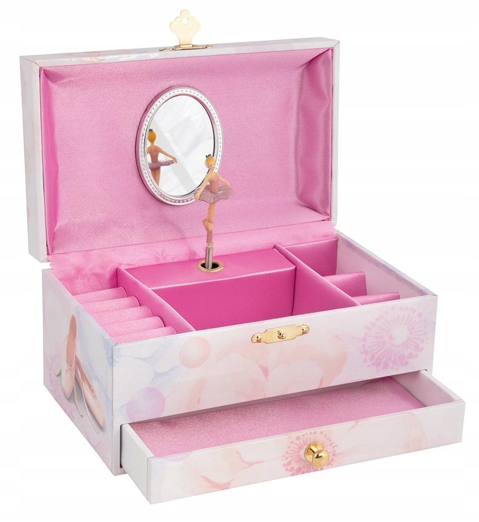 Ця красива скринька, краї якої прикрашені ніжними квітами, а верх прикрашена балериною з діадемою, має додатковий ящик внизу. Основна частина поділена на три зони: