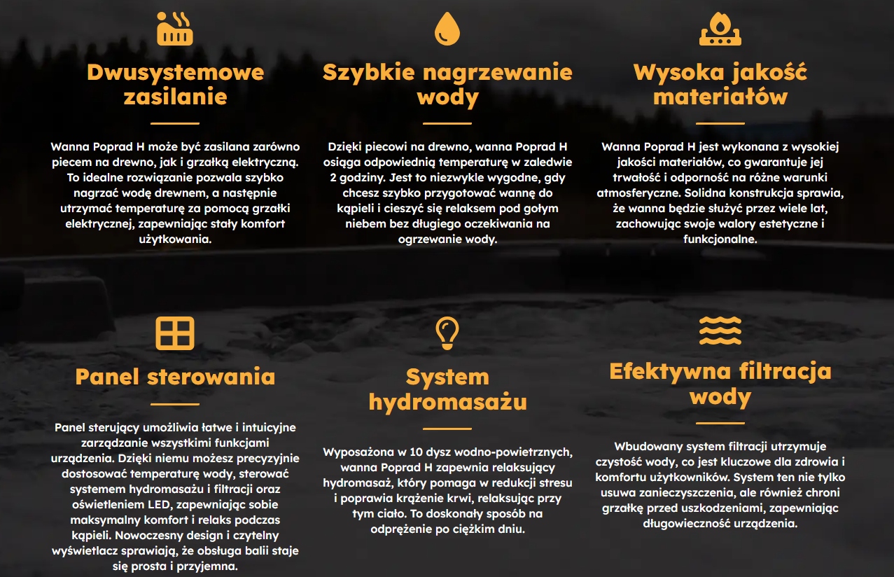 Poprad H Garden Bathtub - це інноваційне рішення, що поєднує дерев’яний та електричний нагрівач , забезпечуючи максимальний комфорт використання. Ідеально підходить для людей, які періодично користуються ванною, але вони хочуть тривати гарячу воду, наприклад Протягом вихідних.