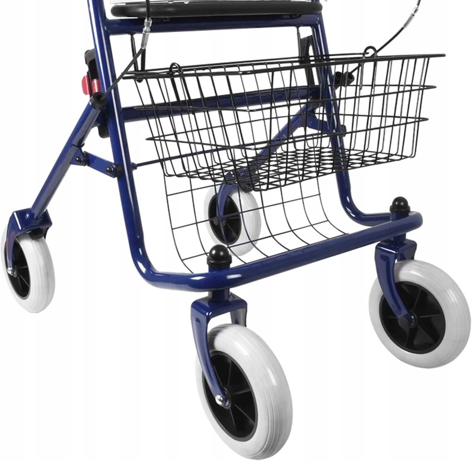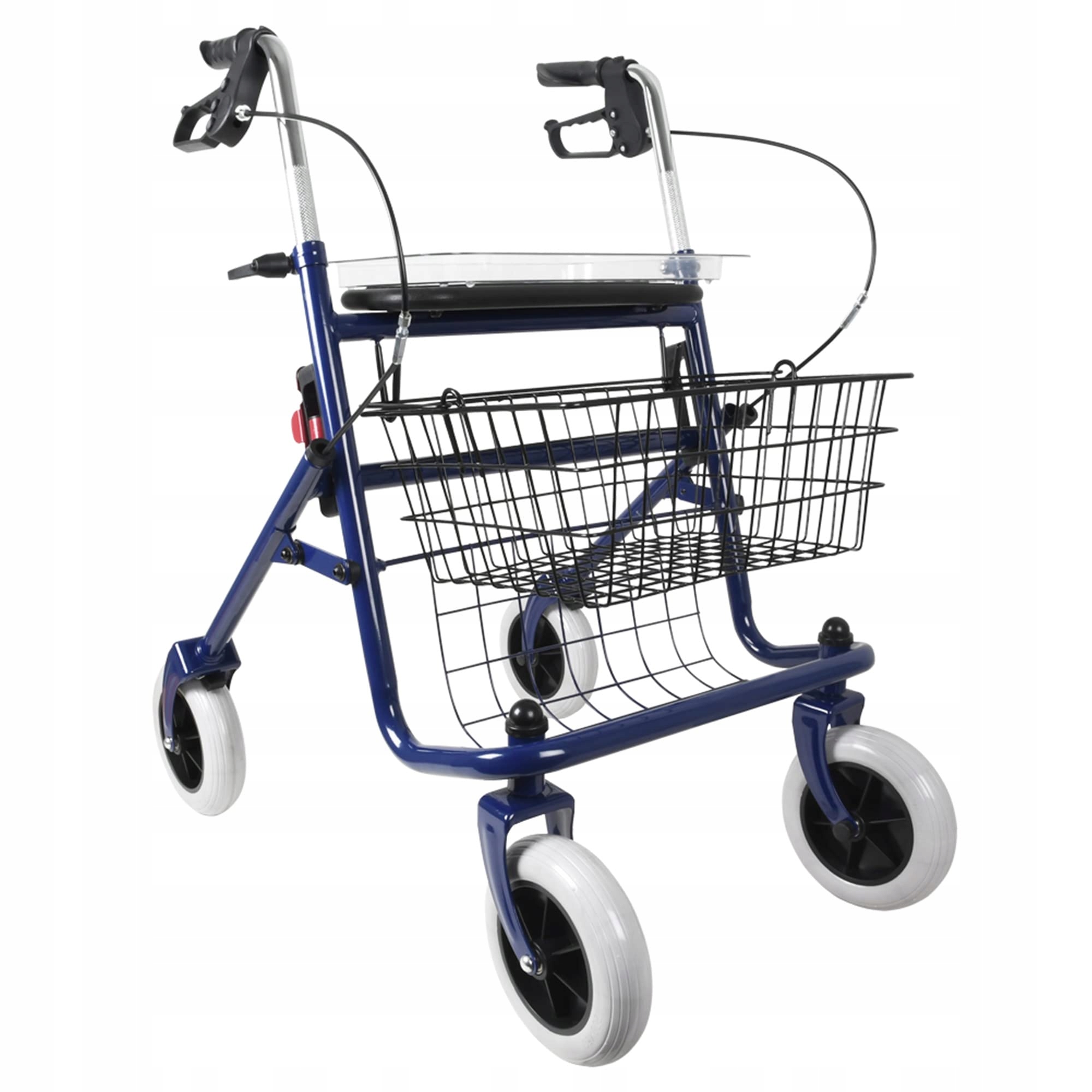 4Синя пофарбована сталь, складна рама з регульованою висотою. З 4 твердими колесами (2 постійними ззаду і 2 ротацією спереду). Ергономічна та регульована ручка та рукоділля. Поставляється з підкладеним сидінням, кошиками для покупок та підносом. • Вага: 12,5 кг • Навантаження: 120 кг • Розміри картону: 610 х 270 х 700 мм регульована висота 71-98 см.