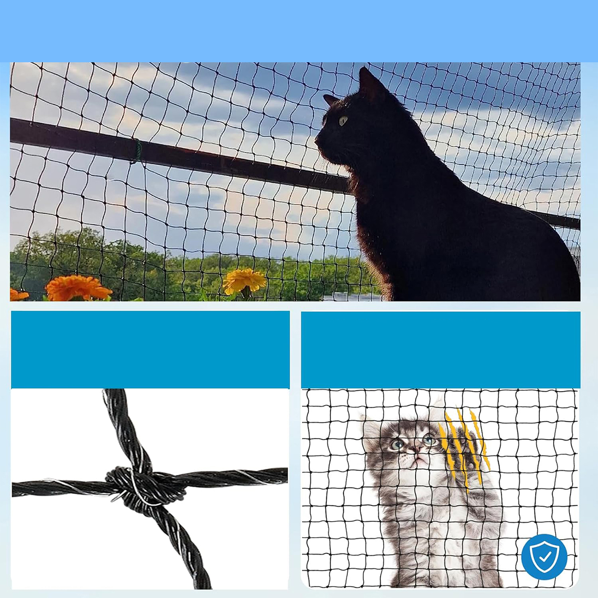 Захист безпеки та оптимальна видимість: наша балконна сітка для котів запобігає падінню котів з балконів і забезпечує безпеку кішки, коли грає високо над ними, навіть коли ви не поруч. Сітка 3 х 3 см забезпечує хорошу видимість для вас та вашої кішки.