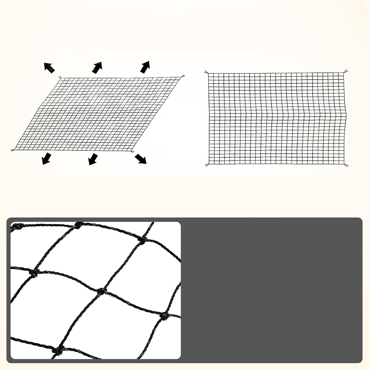 Проста установка: кожен набір котів для котів постачається з інструкціями, додатковою мотузкою, гачками та нігтями для задоволення широкого спектру вимог до встановлення. Ви повинні уважно прочитати інструкції перед встановленням. Помаранчеві лінії маркування розташовані на чотирьох кутах кожної котячої сітки. Візьміть лінії маркування на чотирьох рогах, щоб розкинути сітку з форми алмазу в прямокутник.