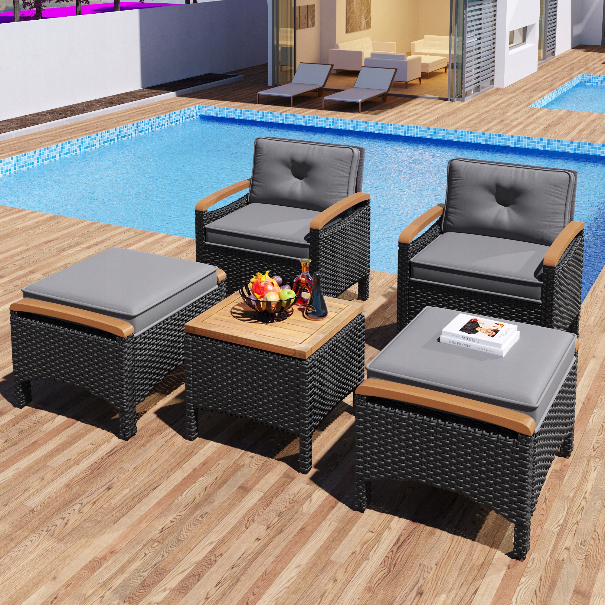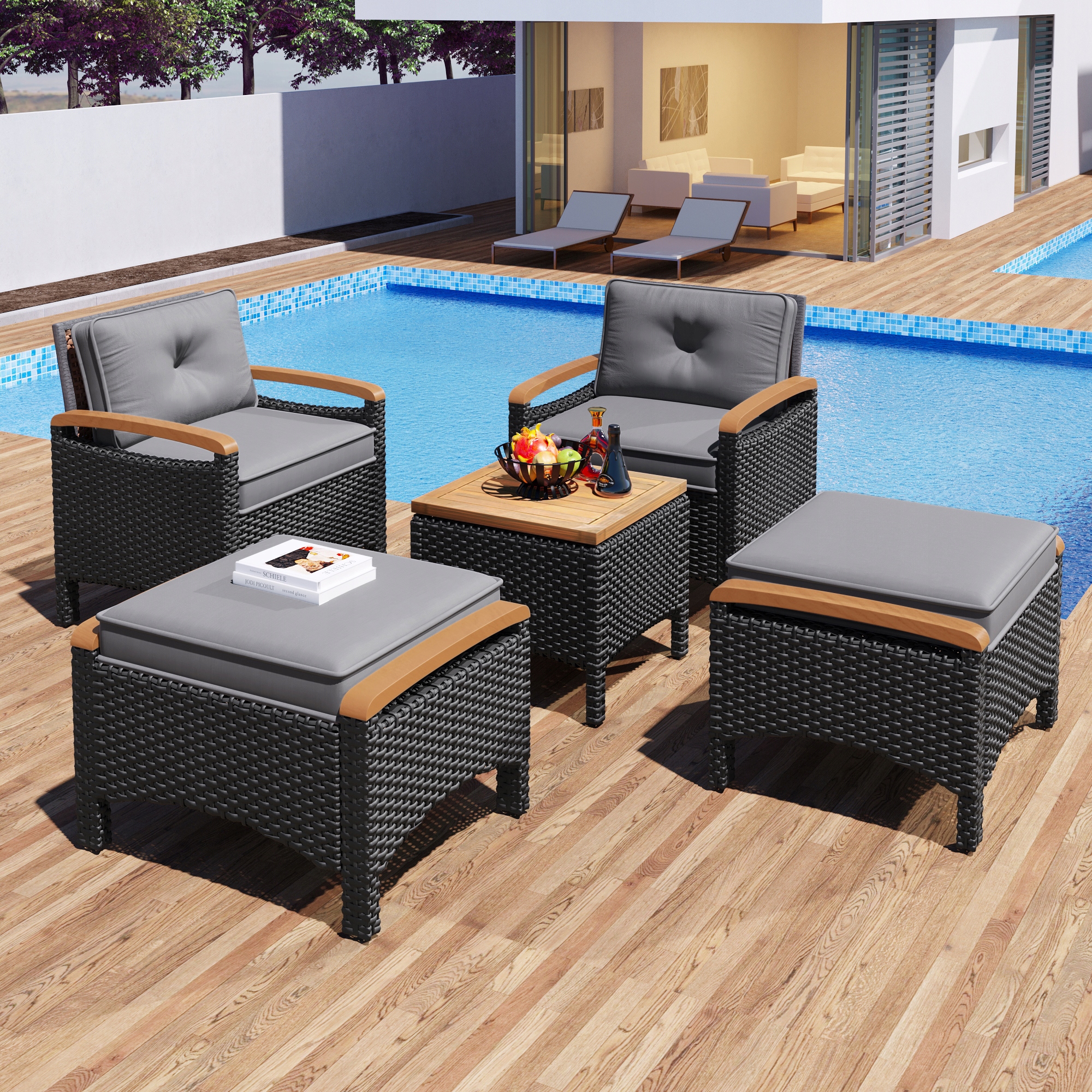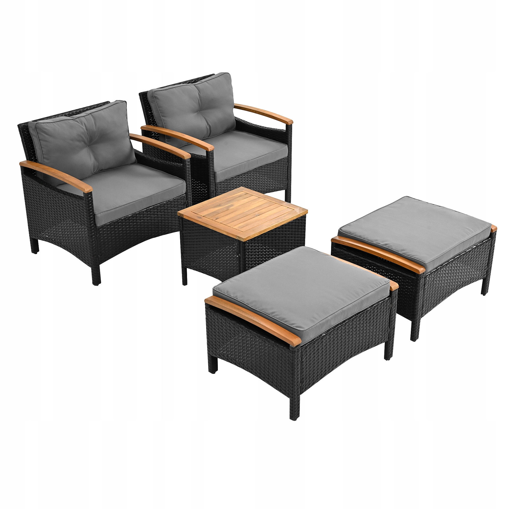 Балконний гарнітур з ротанга (5 елементів), стіл з акації з сірими подушками, вантажопідйомність 160 кг