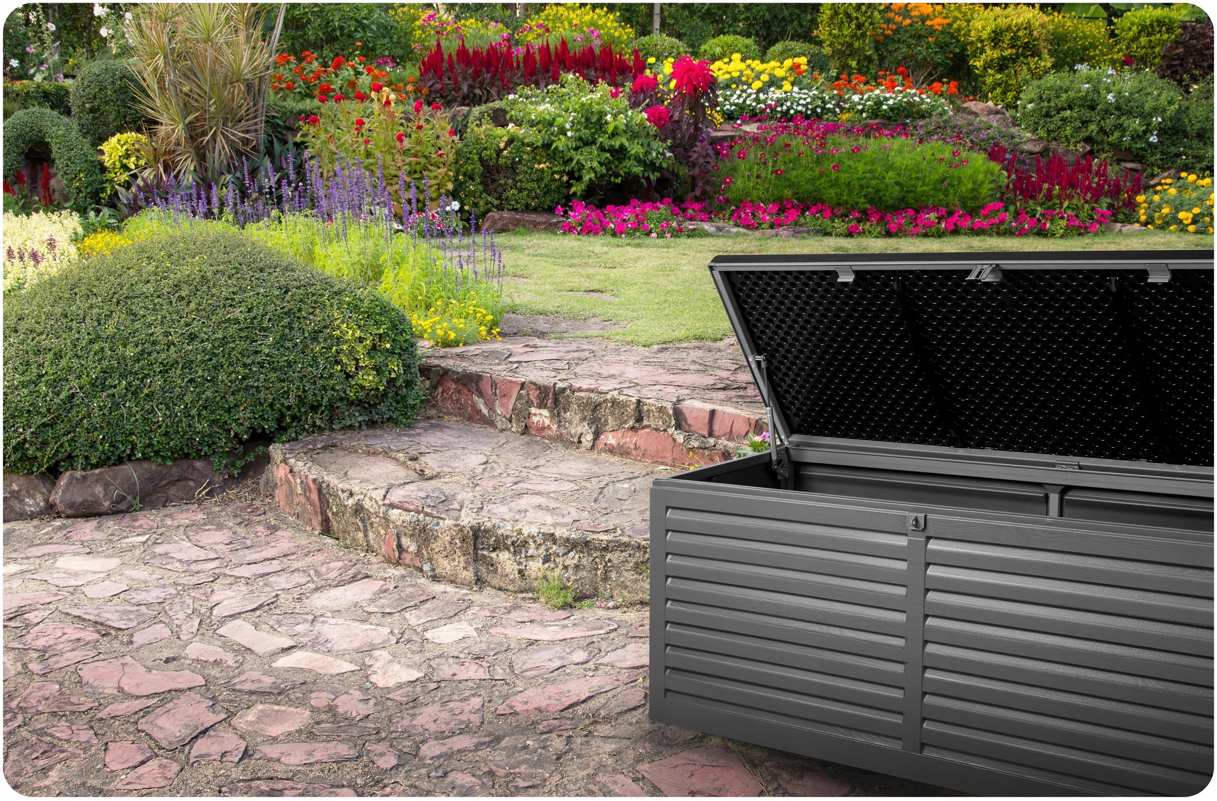 Місткий садовий ящик полегшує зберігання в саду, на балконі та вдома необхідних речей, якими ми користуємося щодня (подушок, матраців, чохлів, іграшок, інструментів) та багато іншого.