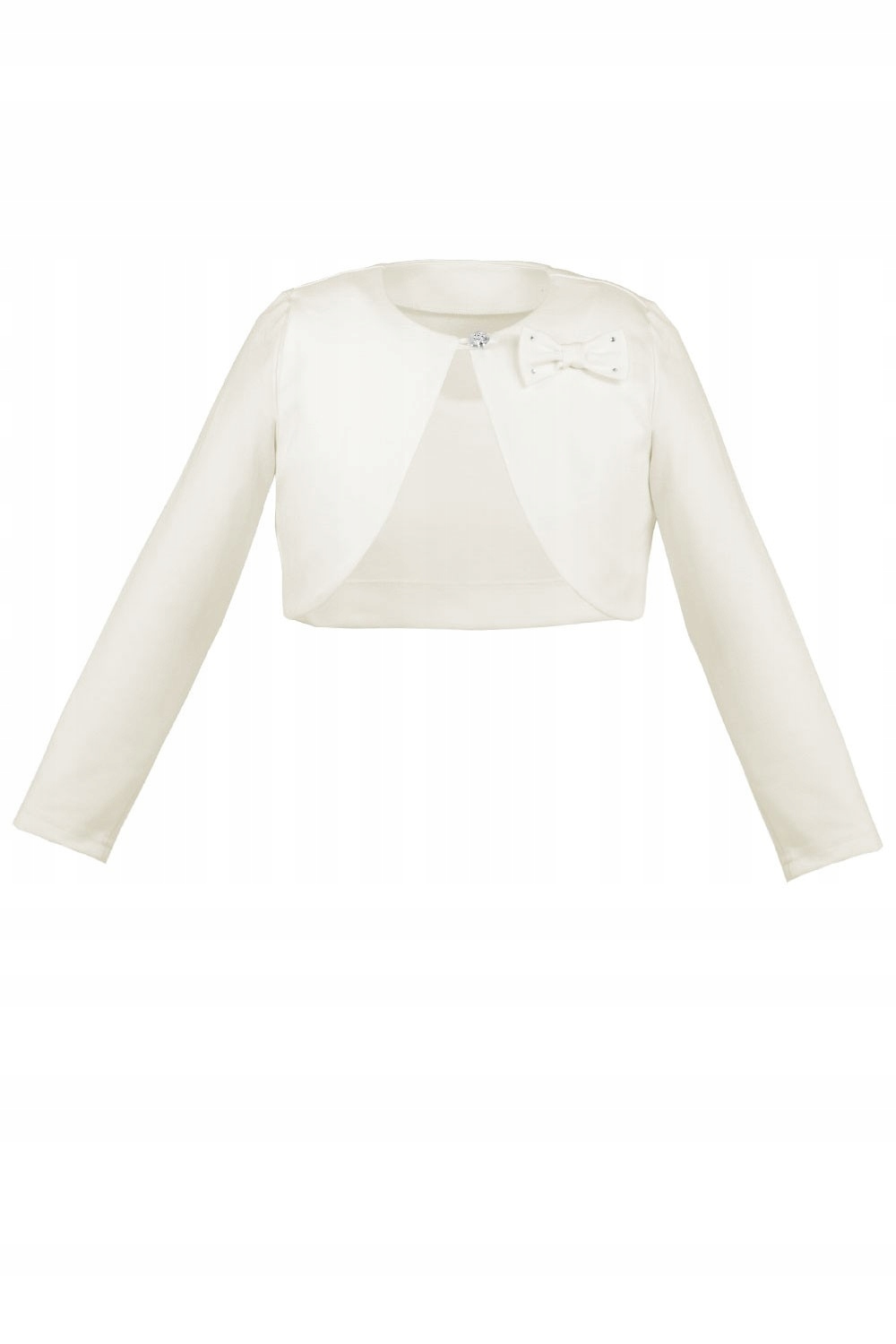 Болеро з щільної тканини пунто підійде до сукні чи блузки. Застібається спереду на ґудзик і прикрашена витонченим бантом з цирконами. Коротший виріз не закриває сукню. Ідеально підходить для холодних днів.