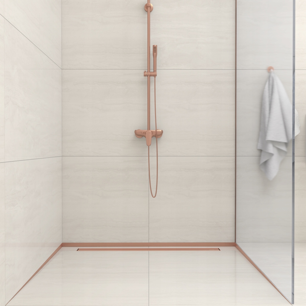 - Нахил для лінійного водостоку є естетичним оздобленням душової кабіни та додає елегантності всьому інтер’єру. li>